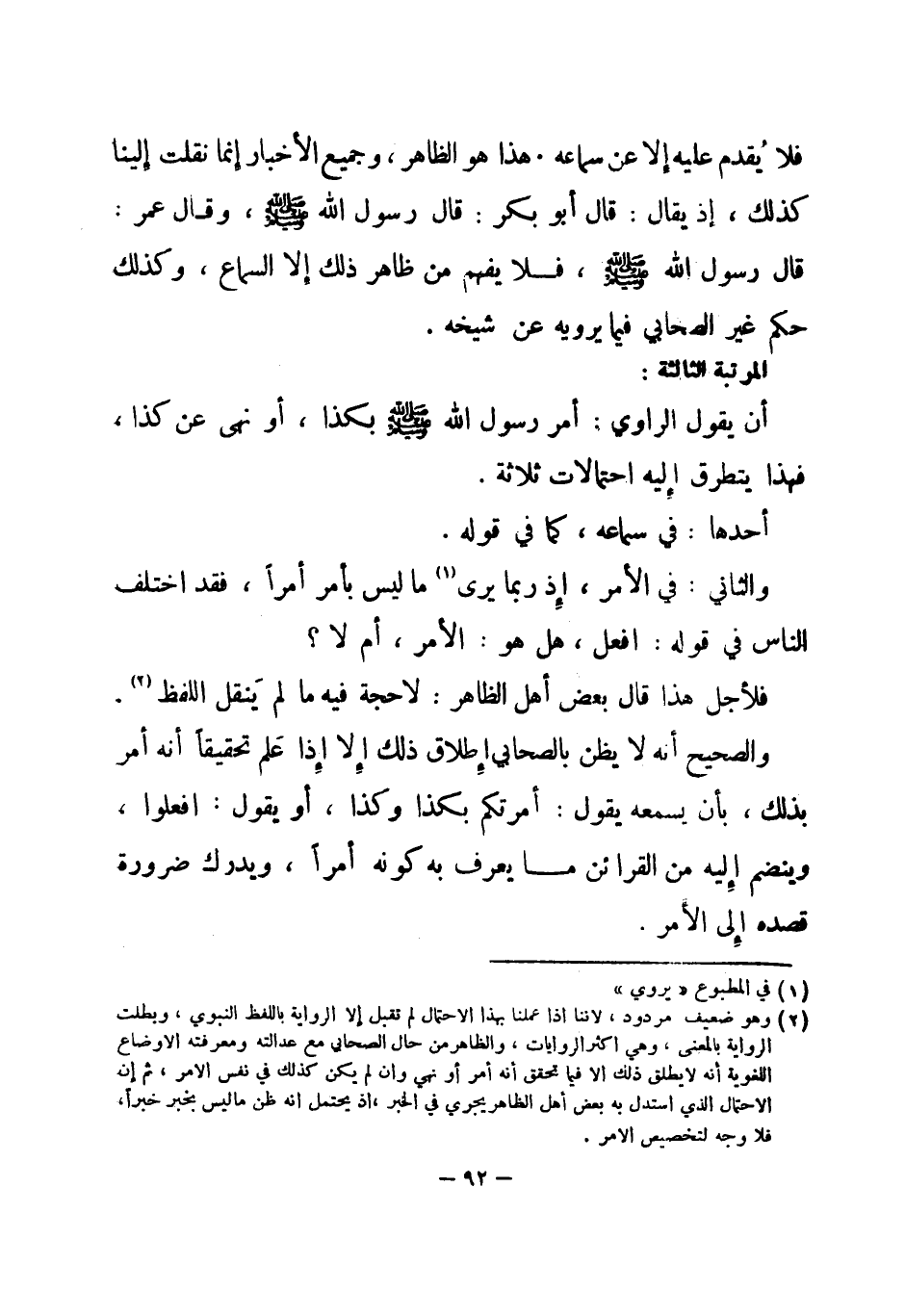 (¬2) وهو ضعيف مردود، لأننا إذا عملنا بهذا الاحتمال لم تقبل إلا الرواية باللفظ النبوي، وبطلت الرواية بالمعنى، وهي أكثر الروايات، والظاهر من حال الصحابي مع عدالته ومعرفته الأوضاع اللغوية أنه لا يطلق ذلك إلا فيما تحقق أنه أمر أو نهي وإن لم يكن كذلك في نفس الأمر، ثم إن الاحتمال الذي استدل به بعض أهل الظاهر يجري في الخبر، إذ يحتمل أنه ظن ما ليس بخبر خبراً، فلا وجه لتخصيص الأمر.