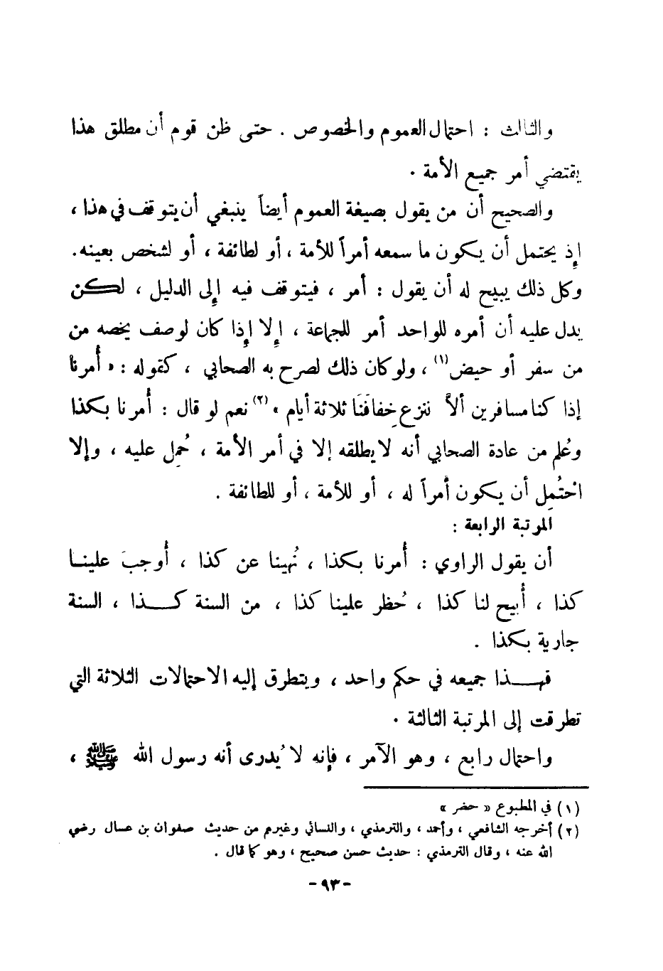 وكل ذلك يبيح له أن يقول: أمر، فيتوقف فيه إلى الدليل، لكن يدل عليه أن أمره للواحد أمر للجماعة، إلا إذا كان لوصف يخصه من سفر أو حيض (¬1) ، ولو كان ذلك لصرح به الصحابي، كقوله: «أُمرنا إذا كنا مسافرين ألا ننزع خِفَافنا ثلاثة أيام» (¬2) نعم لو قال: أُمرنا بكذا وعُلم من عادة الصحابي أنه لا يطلقه إلا في أمر الأمة حُمِل عليه وإلا احتُمِل أن يكون أمراً له، أو للأمة، أو للطائفة.