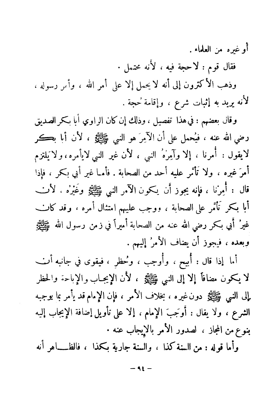 وقال بعضهم: في هذا تفصيل، وذلك إن كان الراوي أبا بكر الصديق - رضي الله عنه - فيُحمل على أن الآمِرَ هو النبي - صلى الله عليه وسلم -، لأن أبا بكر لا يقول: أُمرنا، إلا وآمِرُهُ النبي، لأن غير النبي لا يأمره، ولا يَلتزم أمرَ غيره، ولا تَأمَّر عليه أحد من الصحابة. فأما غير أبي بكر، فإذا قال: أُمِرْنا، فإنه