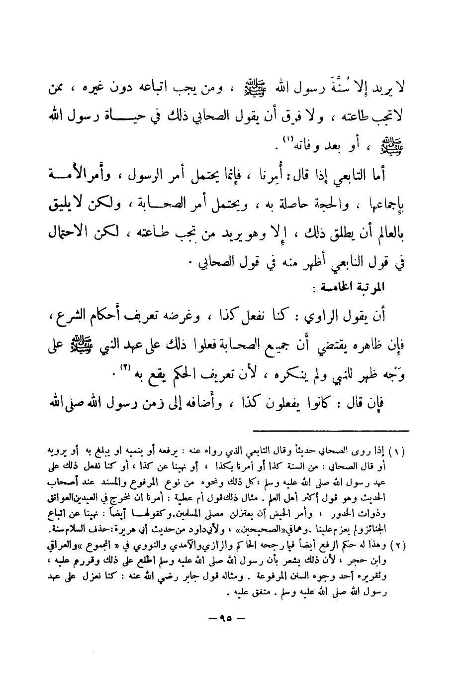 أن يقول الراوي: كنا نفعل كذا، وغرضه تعريف أحكام الشرع، فإن ظاهره يقتضي أن جميع الصحابة فعلوا ذلك على عهد النبي - صلى الله عليه وسلم - على وجه ظهر للنبي ولم ينكره، لأن تعريف الحكم يقع به (¬2) .