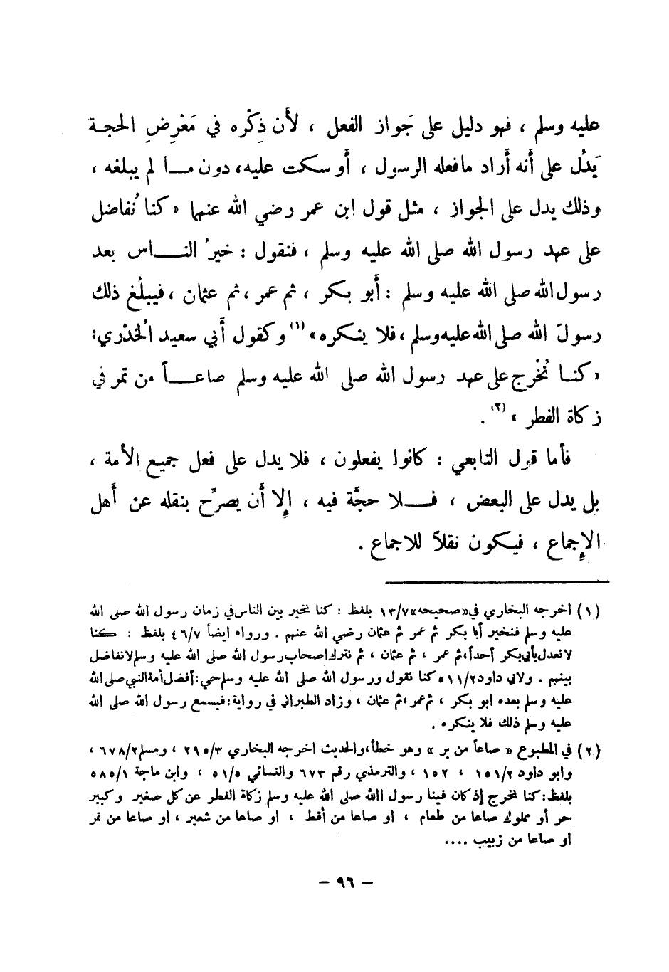 عليه وسلم -، فهو دليل على جَواز الفعل، لأن ذِكْره في معرض الحجة يدل على أنه أراد ما فعله الرسول أو سكت عليه، دون ما لم يبلغه، وذلك يدل على الجواز، مثل قول ابن عمر - رضي الله عنهما - «كنا نُفاضل على عهد الرسول - صلى الله عليه وسلم -، فنقول: خير الناس بعد رسول الله - صلى الله عليه وسلم -: أبو بكر، ثم عمر، ثم عثمان، فيبلغ ذلك رسول الله - صلى الله عليه وسلم - فلا ينكره (¬1) وكقول أبي سعيد الخدري: «كنا نُخْرج على عهد رسول الله - صلى الله عليه وسلم - صاعاً من تمر في زكاة الفطر» (¬2) .