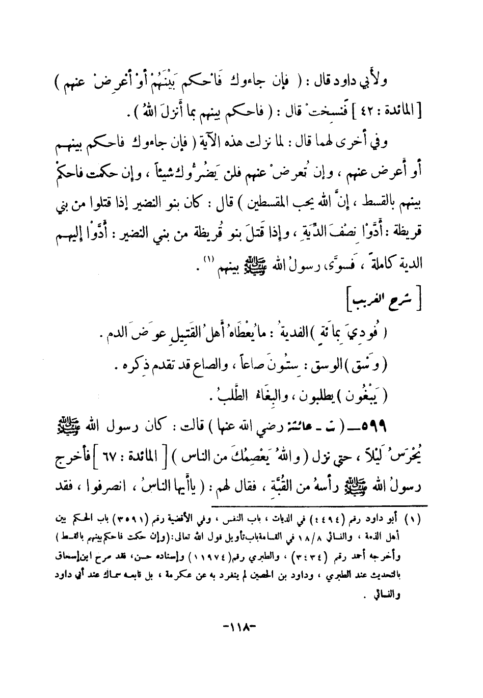 599 - (ت) عائشة - رضي الله عنها - قالت: كان رسول الله صلى الله عليه وسلم يُحْرَسُ ليْلاً، حتى نزل {واللَّهُ يَعْصِمُكَ من النَّاس} [المائدة: 67] فأخرج رسولُ الله صلى الله عليه وسلم رأسهُ من القُبَّةِ، فقال لهم: «يا أَيُّها الناسُ، انصرفوا، فقد -[119]- عَصمَنِي الله» . أخرجه الترمذي (¬1) .