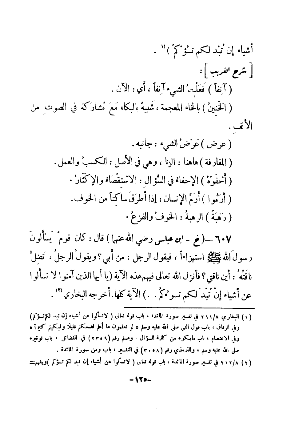 607 - (خ) ابن عباس - رضي الله عنهما -: قال: كان قومٌ يَسْأَلونَ رسولَ الله صلى الله عليه وسلم استهزاءاً، فيقول الرجل: من أبي؟ ويقولُ الرجلُ، تَضِلُّ ناقَتُهُ: أَين ناقتي؟ فأنزل اللهُ تعالى فيهم هذه الآية {يا أيُّها الذين آمنوا لا تسأَلوا عن أشياء إنْ تُبْدَ لكم تَسُؤْكُمْ ... } الآية كلها. أخرجه البخاري (¬1) .