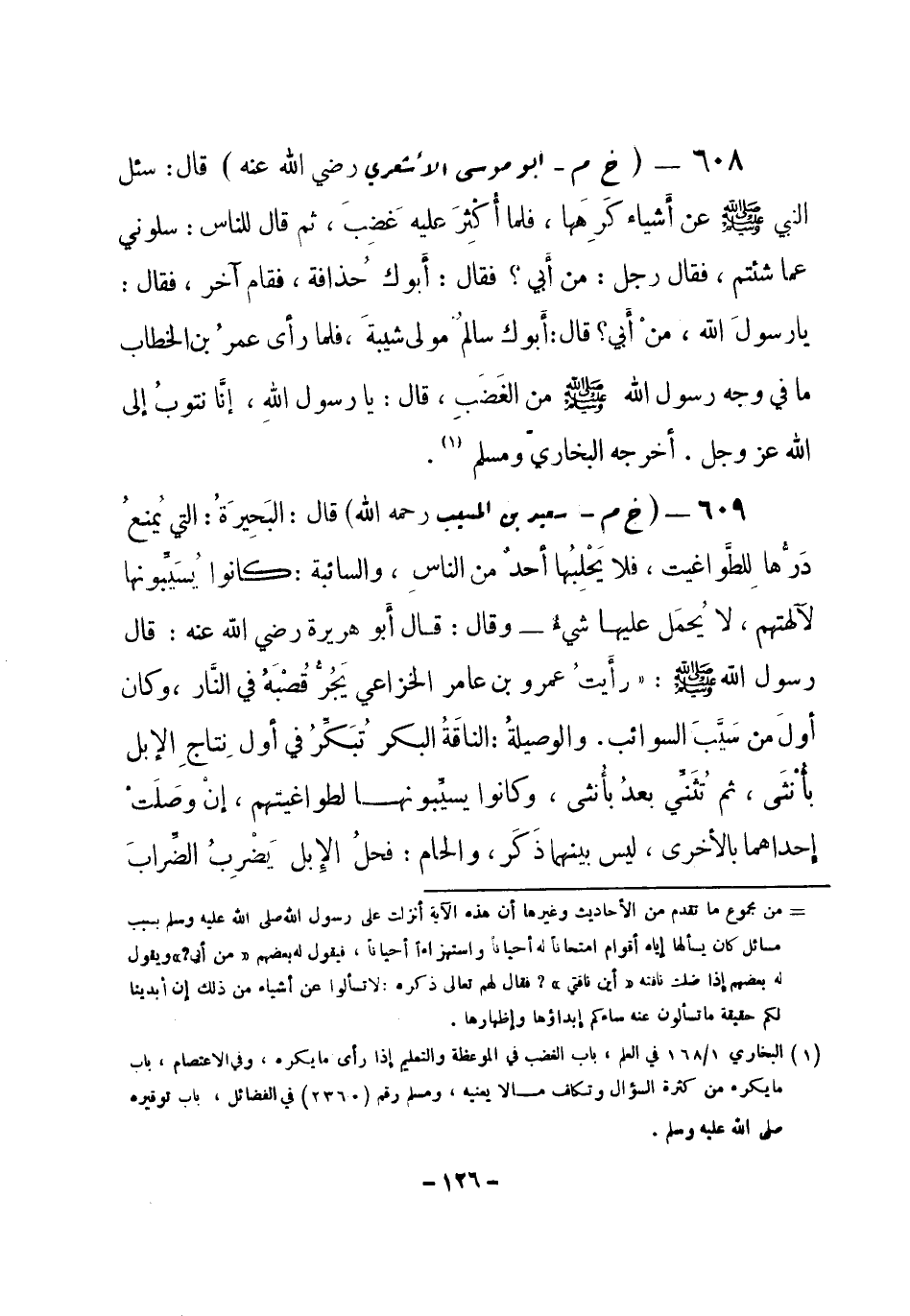 608 - (خ م) أبو موسى الأشعري - رضي الله عنه -: قال: سئل النبي صلى الله عليه وسلم عن أَشياء كَرِهَها، فلما أُكْثِرَ عليه غَضِبَ، ثم قال للناس: سلوني عما شئتم، فقال رجل: من أبي؟ فقال: أبوك حُذافةُ، فقام آخر، فقال: يا رسولَ الله، منْ أبي؟ قال:أبوك سالمٌ مولى شيبةَ، فلما رأى عمرُ بن الخطاب ما في وجه رسول الله صلى الله عليه وسلم من الغَضَبِ، قال: يا رسول اللهِ، إنَّا نتوبُ إلى الله عز وجل. أخرجه البخاري ومسلم (¬1) .