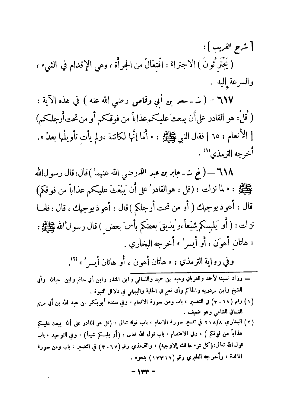 617 - (ت) سعد بن أبي وقاص - رضي الله عنه -:في هذه الآية: {قُلْ هو القادر على أَن يبعثَ عليكم عذاباً من فوقكم أو من تحت أَرجلكم} [الأنعام: 65] فقال النَّبِيُّ صلى الله عليه وسلم: «أمَا إنَّها لكائنة، ولم يأتِ تأويلُها بعدُ» . أخرجه الترمذي (¬1) .