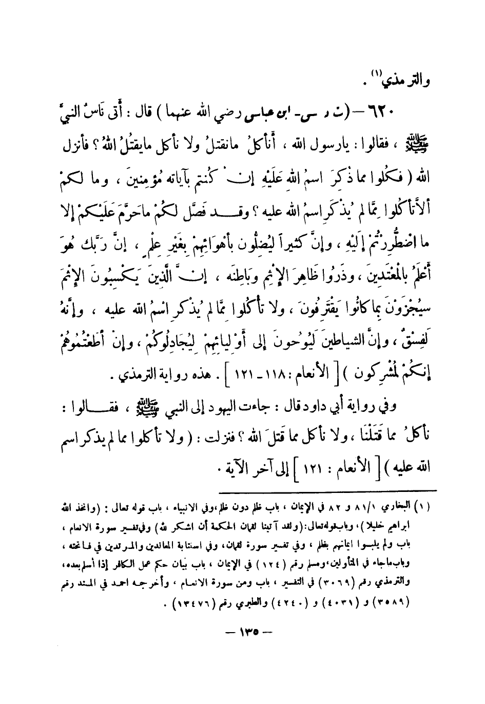 620 - (ت د س) ابن عباس - رضي الله عنهما -: قال: أتى نَاسٌ النبيَّ صلى الله عليه وسلم، فقالوا: يا رسول الله، أَنأكلُ ما نقتلُ ولا نأكل ما يقتلُ اللهُ؟ فأنزل الله {فكُلوا مِمَّا ذُكِرَ اسمُ اللَّهِ عَلَيْهِ إن كُنتم بآياته مُؤمِنينَ. وما لكمْ ألَّا تأكلُوا مِمَّا ذْكَرِ اسمُ اللَّه عليه وقد فَصَّل لكُمْ ما حَرَّمَ عَلَيْكمْ إلا ما اضْطُّرِرْتُمْ إلَيْهِ وإنَّ كثيراً ليُضِلُّون بأهْوَائِهِمْ بِغَيْرِ عِلْمٍ إنَّ رَبَّك هُوَ أعْلَمُ بالْمُعْتَدِين. وذَرُوا ظَاهِرَ الإِثْمِ وبَاطِنَه إنَّ الذينَ يَكْسِبُونَ الإِثْمَ سيُجْزَوْنَ بِما كانُوا يَقْتَرِفُونَ. ولا تأكُلوا مِمَّا لم يُذْكرِ اسْمُ اللَّه عليه وإنَّهُ لَفِسْقٌ وإنَّ الشياطينَ لَيُوحُونَ إلى أوْلِيائِهِمْ لِيُجَادِلُوكُمْ وإنْ أطَعْتُمُوهُمْ إنكُمْ لمُشْرِكون} [الأنعام: 118 - 121] . هذه رواية الترمذي.