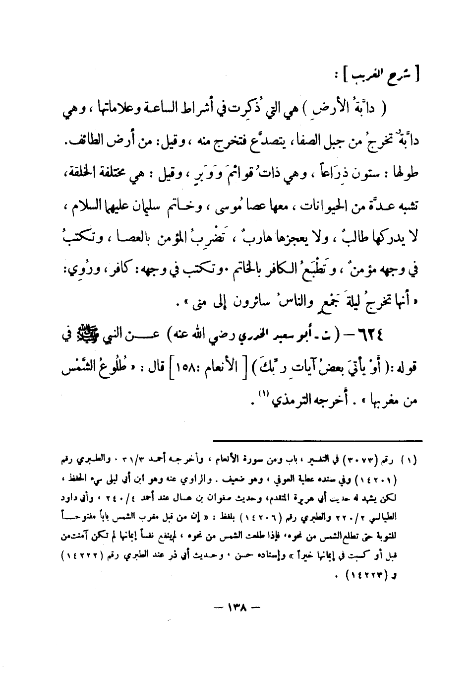 624 - (ت) أبو سعيد الخدري - رضي الله عنه -: عن النبي صلى الله عليه وسلم في قوله: {أَوْ يَأْتِيَ بعضُ آياتِ ربِّكَ} [الأنعام: 158] قال: «طُلُوعُ الشَّمْس من مغربها» . أخرجه الترمذي (¬1) .