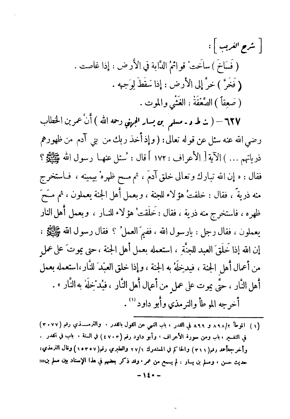 627 - (ت ط د) مسلم بن يسار الجهني -رحمه الله -: أنَّ عمر بن الخطاب -رضي الله عنه سئل عن قوله تعالى: {وإذ أخذ ربك من بني آدم من ظهورهم ذرَّياتِهم ... } الآية [الأَعراف: 172] قال: سُئل عنها رسول الله صلى الله عليه وسلم؟ فقال: «إن الله تبارك وتعالى خلق آدمَ، ثم مسح ظهرهُ بيمينه، فاستخرج منه ذرية، فقال: خلقتُ هؤلاء للجنة، وبعمل أَهل الجنة يعملون، ثم مسَحَ ظهره، فاستخرج منه ذرية، فقال: خَلَقتُ هؤلاء للنار، وبعمل أهل النار يعملون، فقال رجل: يا رسول الله، ففيمَ العملُ؟ فقال رسول الله صلى الله عليه وسلم: إن الله إذا خَلَقَ العبد للجنَّةِ، استعمله بعمل أهل الجنة حتى يموتَ على عملٍ من أعمال أهلِ الجنة، فيدِخلَهُ به الجنة، وإذا خلق العبْدَ للنَّار، استعمله بعمل أهل النَّار، حتَّى يموت على عملٍ من أعمال أهل النَّار، فيُدْخِلَهُ به النَّار» . أخرجه الموطأ والترمذي وأبو داود (¬1) . -[141]-