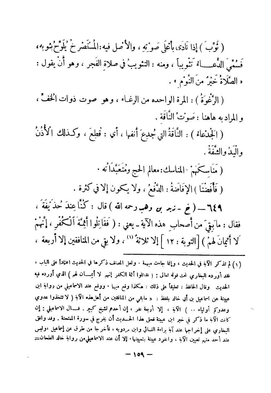 649 - (خ) زيد بن وهب -رحمه الله -: قال: كُنَّا عِندَ حُذَيْفَةَ، فقال: ما بَقِيَ من أصحابِ هذه الآية يعني {فَقَاتِلُوا أَئِمَّةَ الْكُفْرِ إِنَّهُمْ لَا أَيْمانَ لهُم} [التوبة: 12] إلا ثلاثةٌ (¬1) ، ولا بقي من المنافقين إلا أربعة، -[160]- فقال أعرابيٌّ: إنكم أصحابَ محمدٍ، تخبرونا أخباراً، لا ندري ما هي؟ تزعمون أن لا مُنافقَ إلا أربعة، فما بالُ هؤلاء الذي يَبْقُرون بيوتنا، ويَسْرِقون أعلاقنا؟ قال: أولئك الفُسَّاق، أجَلْ لم يبق منهم إلا أربعةٌ: أحدهم: شيخ كبير لو شَربَ الماءَ الباردَ لما وجدَ بَرْدَهُ (¬2) . أخرجه البخاري (¬3) .