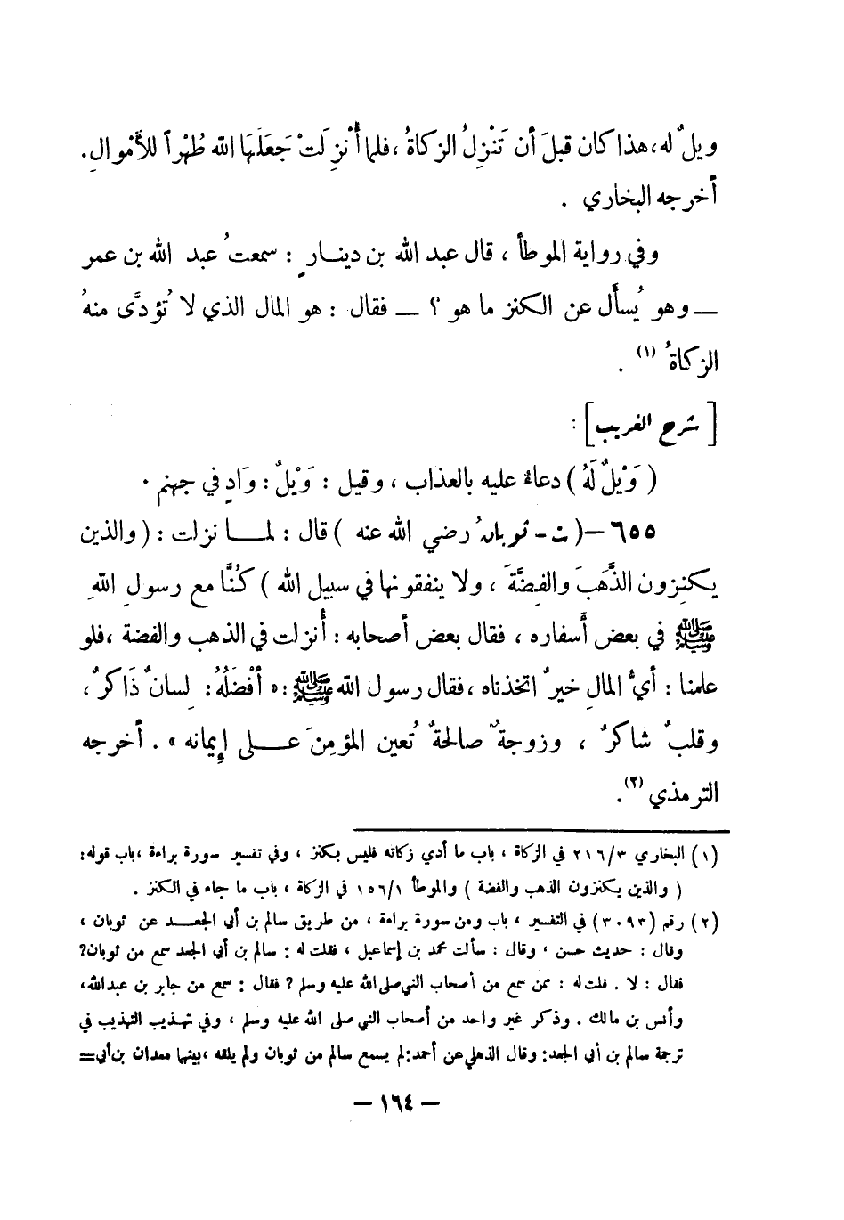 655 - (ت) ثوبانُ - رضي الله عنه -: قال: لما نزلت: {والَّذِينَ يَكْنِزُونَ الذَّهَبَ والْفِضَّةَ ولا يُنْفِقُونَها في سبيل اللَّه} كُنَّا مع رسولِ اللهِ صلى الله عليه وسلم في بعض أسفاره، فقال بعض أصحابه: أُنزلت في الذهب والفضة، فلو علمنا: أيُّ المالِ خيرٌ اتخذناه، فقال رسول الله صلى الله عليه وسلم: «أفْضَلهُ: لِسانٌ ذَاكرٌ، وقلبٌ شاكرٌ، وزوجةٌ صالحةٌ تُعين المؤمِنَ على إيمانه» . أخرجه الترمذي (¬1) .