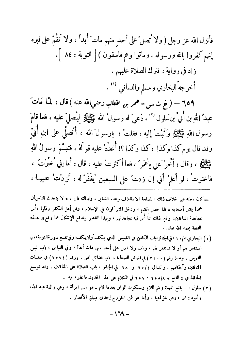(¬3) البخاري 3 / 181 في الجنائز، باب ما يكره من الصلاة على المنافقين، وفي تفسير سورة براءة، باب {استغفر لهم أو لا تستغفر لهم} ، والترمذي رقم (3096) في التفسير، باب ومن سورة براءة، والنسائي 4 / 68 في الجنائز، باب الصلاة على المنافقين.