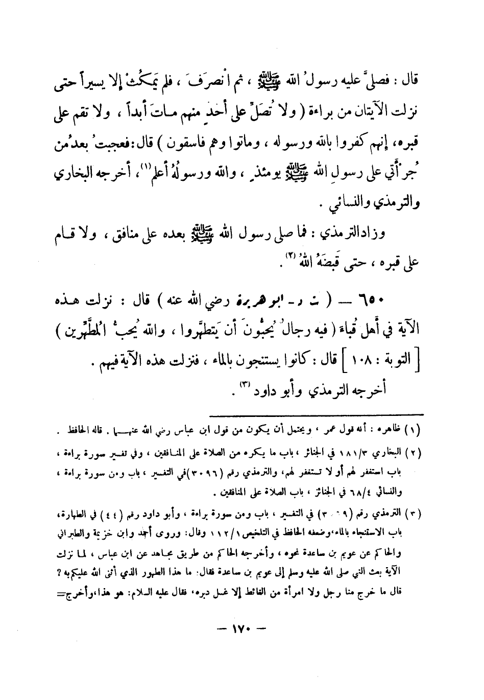 660 - (ت د) - أبو هريرة- رضي الله عنه-: قال: نزلت هذه الآية في أَهل قُباءَ {فيه رجالٌ يُحبُّونَ أَن يَتطَهروا والله يُحبُّ المُطَّهِّرين} [التوبة: 108] قال: كانوا يَسْتَنجُونَ بالماء، فنزلت هذه الآية فيهم. أَخرجه الترمذي وأَبو داود (¬1) .