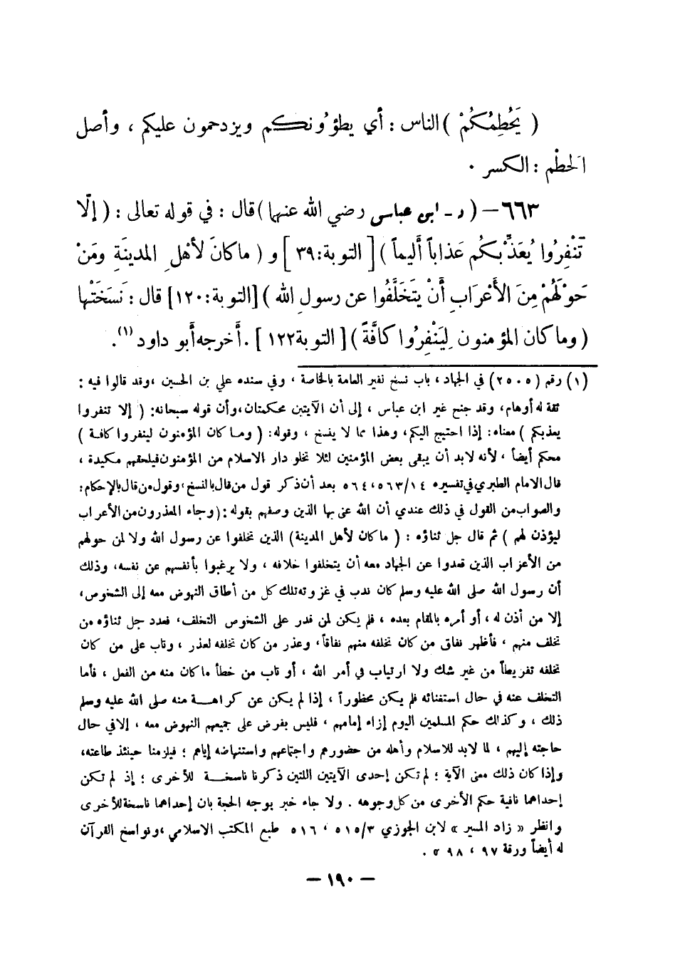 663 - (د) ابن عباس - رضي الله عنهما -: قال: في قوله تعالى: {إلّا تَنْفِرُوا يُعَذِّبْكُم عَذاباً أَليماً} [التوبة: 39] و {ما كانَ لأهْلِ المدينَةِ ومَنْ حَوْلَهُمْ مِنَ الأَعْرَابِ أَنْ يتَخَلَّفُوا عن رسولِ اللَّه} [التوبة: 120] قال: نَسَخَتْها {وما كان المؤمنون لِيَنْفِرُوا كافَّةً} [التوبة: 122] . أخرجه أبو داود (¬1) .