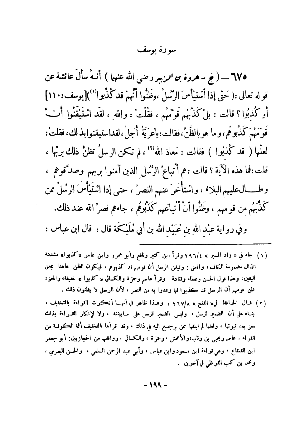 675 - (خ) عروة بن الزبير - رضي الله عنهما -: أنهُ سألَ عائشة عن قوله تعالى: {حَتَّى إذا اسْتيْأسَ الرُّسُلُ وظَنُّوا أنَّهمْ قد كُذِّبوا (¬1) } [يوسف: 110] أَو كُذِبُوا؟ قالت: بلْ كَذَّبَهُم قَوْمُهُم، فقُلْتُ: واللهِ، لقَد اسْتَيْقَنُوا أَنَّ قَوْمَهُمْ كَذَّبوهُم، وما هو بالظَّنِّ، فقالت: يا عُرَيَّةُ أجَلْ، لقد استيقنوا بذلك، فقلتُ: لعلَّها {قد كُذِبُوا} فقالت: معاذ الله (¬2) ، لم تكن الرسل تظن ذلك بربها، قلت: فما هذه الآية؟ قالت: هم أَتْباعُ الرُّسُلِ الذين آمنوا بربهم وصدَّقوهم، وطال عليهم البلاءُ، واسْتأْخَرَ عنهم النصرُ، حتى إذا اسْتَيْأَسَ الرسُلُ ممن كَذَّبَهُم مِن قومهم، وظَنُّوا أنَّ أتْباعَهم كَذَّبُوهُم، جاءهم نصرُ الله عند ذلك.