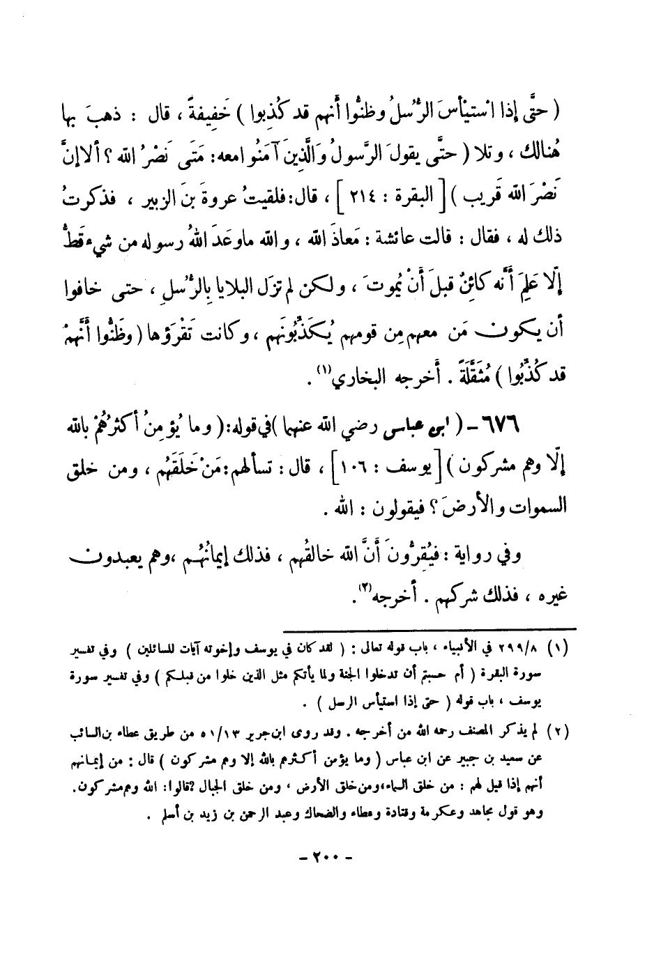 676 - () ابن عباس - رضي الله عنهما -: في قوله: {وما يُؤمِنُ أكثَرُهُمْ بالله إِلاّ وهم مشركون} [يوسف: 106] ، قال: تسألهم: مَنْ خَلَقَهُم، ومن خلق السموات والأرضَ؟ فيقولون: اللَّه.