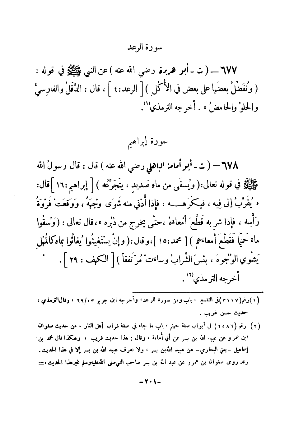 677 - (ت) أبو هريرة - رضي الله عنه -: عن النبيِّ صلى الله عليه وسلم في قوله: {ونُفَضِّلُ بعضَها على بعض في الأُكُلِ} [الرعد: 4] ، قال: «الدَّقَلُ والفارِسيُّ والحلوُ والحامضُ» . أخرجه الترمذي (¬1) .