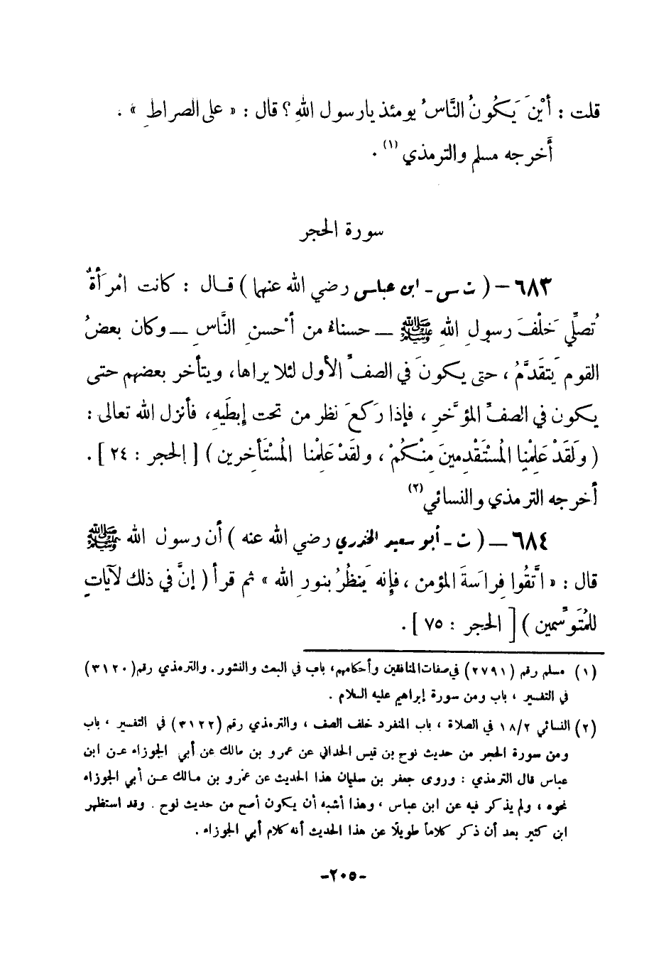 683 - (ت س) ابن عباس - رضي الله عنهما -: قال: كانت امْرَأةٌ تُصلِّي خَلْفَ رسولِ اللهِ صلى الله عليه وسلم حسناءُ من أحْسنِ النَّاسِ - وكان بعضُ القومَ يتقَدَّمُ، حتى يكونَ في الصفِّ الأول لئلا يراها، ويتأخر بعضهم حتى يكون في الصفِّ المؤَّخرِ، فإذا رَكعَ نظر من تحت إِبطَيهِ، فأنزل الله تعالى: {ولَقَدْ عَلِمْنا المُسْتَقْدِمينَ مِنْكُمْ ولقَدْ عَلِمْنا المُسْتَأخِرين} [الحجر: 24] . أخرجه الترمذي، والنسائي (¬1) .