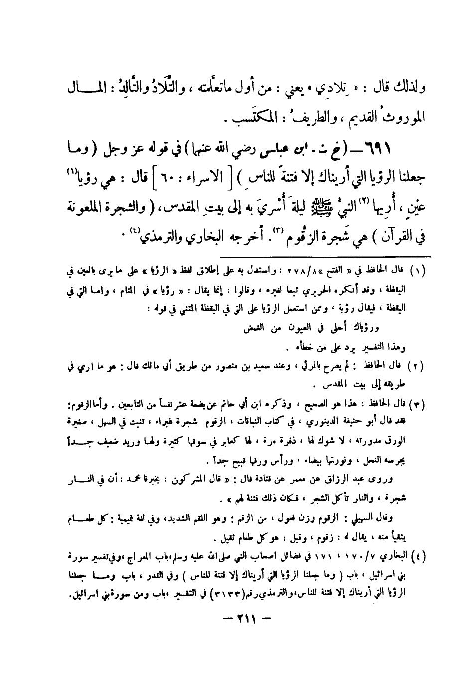 691 - (خ ت) ابن عباس - رضي الله عنهما -: في قوله عز وجل {وما جعلنا الرؤيا التي أريناك إلا فتنةً للناسِ} [الإسراء: 60] ، قال: هي رؤيا (¬1) عَيْنٍ أُرِيها (¬2) النبيُّ صلى الله عليه وسلم ليلةَ أُسْريَ به إلى بيتِ المقدس، {والشجرة الملعونة في القرآن} هي شَجرة الّزَّقُّوم (¬3) . أخرجه البخاري، والترمذي (¬4) . -[212]-
