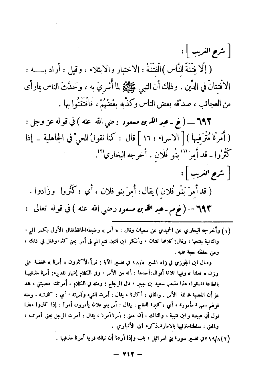 692 - (خ) عبد الله بن مسعود - رضي الله عنه -:في قوله عز وجل: {أَمَرْنا مُتْرَفِيها} [الإسراء: 16] قال: كنا نقولُ للحيِّ في الجاهلية - إذا كَثُرُوا - قد أَمِرَ (¬1) بنُو فُلانٍ. أخرجه البخاري (¬2) .