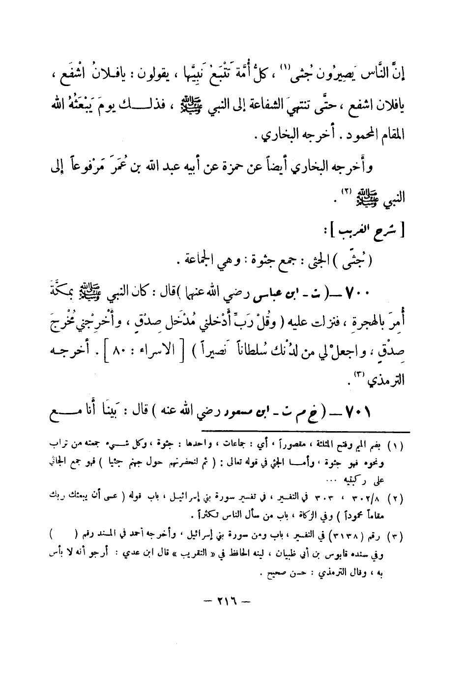 (¬1) رقم (3138) في التفسير، باب ومن سورة بني إسرائيل. وأخرجه أحمد في " المسند " رقم (1948) ، وفي سنده قابوس بن أبي ظبيان، لينه الحافظ في " التقريب " قال ابن عدي: أرجو أنه لا بأس به، وقال الترمذي: حسن صحيح.