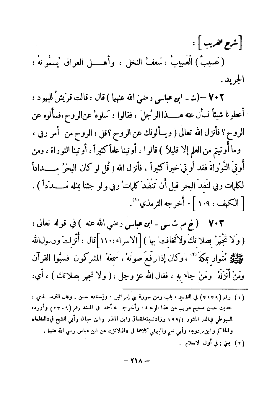 702 - (ت) ابن عباس - رضي الله عنهما -: قال: قالت قريش لليهود: أعطونا شيئاً نسأل عنه هذا الرجل، فقالوا: سلوه عن الروح، فسألوه عن الروح، فأنزل الله تعالى: {ويسألونك عن الروح قُل: الرُّوحُ من أمْرِ رَبِّي وما أُوتيتُم من العلم إلا قليلاً} قالوا: أوتينا علماً كثيراً، أوتينا التوراة، ومن أوتي التوراة فقد أوتي خيراً كثيراً، فأنزل الله: {قُل لو كانَ البحْرُ مِداداً لكلمات ربِّي لنَفِدَ البحرُ قبل أَن تَنْفَدَ كلماتُ ربي ولو جئنا بمثله مَدَداً} [الكهف: 109] . أخرجه الترمذي (¬1) .