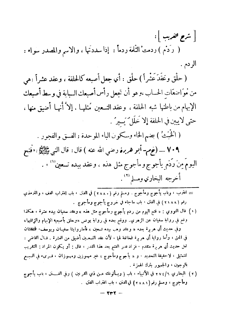 709 - (خ م) أبو هريرة - رضي الله عنه -: قال: قال النبيُّ صلى الله عليه وسلم قال: «فُتِحَ اليومَ مِنْ رَدْمِ يأجوج ومأجوج مثل هذه، وعقد بيده تسعين (¬1) » . أخرجه البخاري، ومسلم (¬2) .