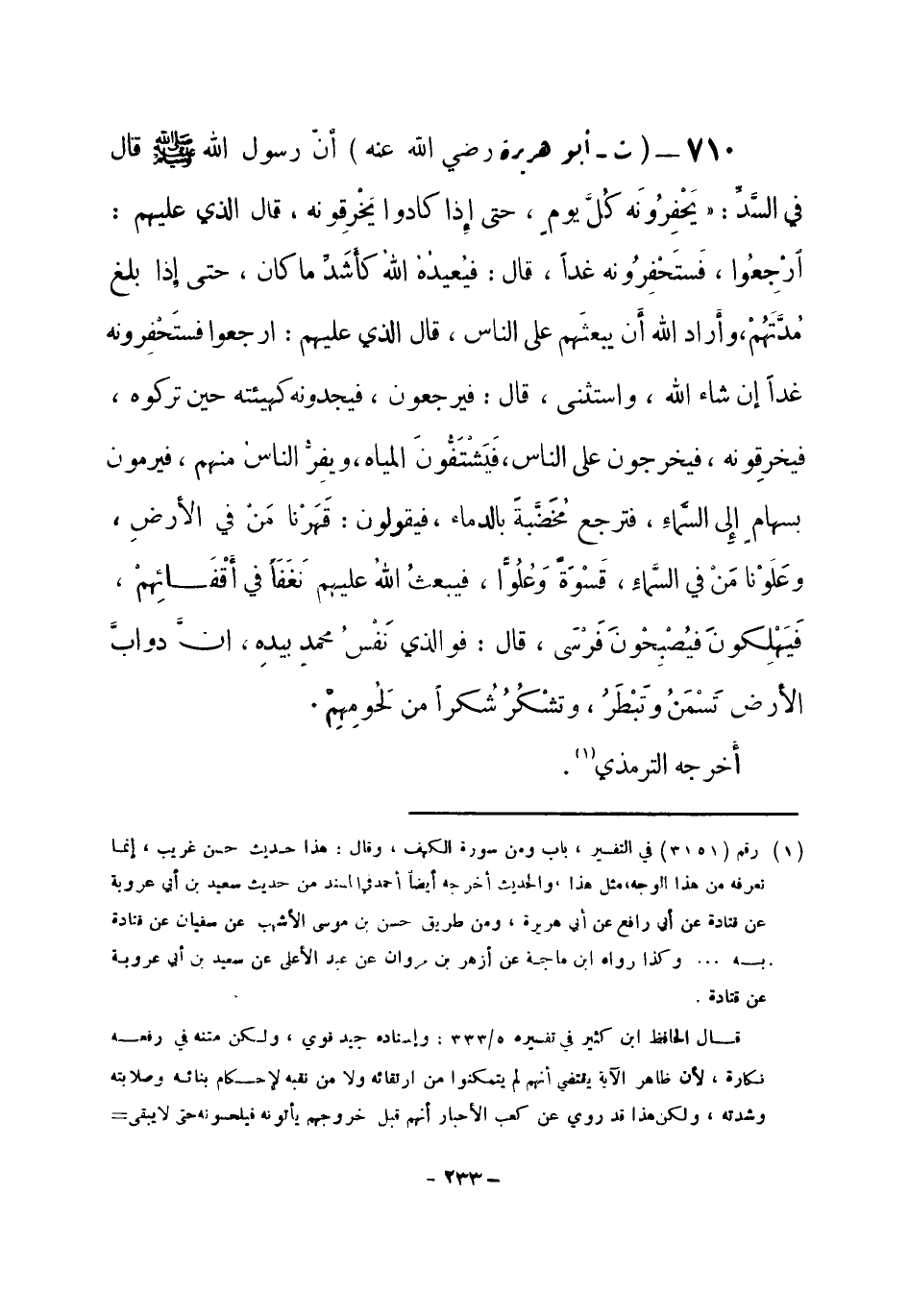 قال الحافظ ابن كثير في تفسيره 5 / 333: وإسناده جيد قوي، ولكن متنه في رفعه نكارة؛ لأن ظاهر الآية يقتضي أنهم لم يتمكنوا من ارتقائه ولا من نقبه لإحكام بنائه وصلابته وشدته، ولكن هذا قد روي عن كعب الأحبار أنهم قبل خروجهم يأتونه فيلحسونه حتى لا يبقى -[234]- منه إلا القليل، فيقولون كذلك، ويصبحون وهو كما كان، فيلحسونه ويقولون: غداً نفتحه، ويلهمون أن يقولوا: إن شاء الله، فيصبحون وهو كما فارقوه. قال ابن كثير: وهذا متجه ولعل أبا هريرة تلقاه من كعب الأحبار، فإنه كثيراً ما يجالسه ويحدثه، فحدث به أبو هريرة، فتوهم بعض الرواة عنه أنه مرفوع فرفعه، والله أعلم. ثم قال ابن كثير: ويؤيد ما قلناه من نكارة هذا المرفوع ومن أنهم لم يتمكنوا من نقبه ولا نقب شيء منه، حديث زينب بنت جحش (يعني الذي تقدم رقم (708)) .