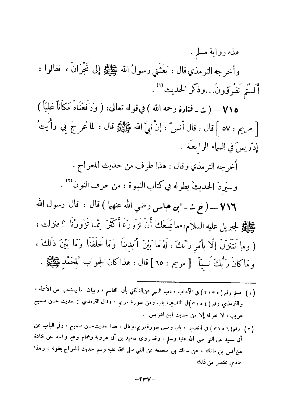 715 - (ت) قتادة -رحمه الله -: في قوله تعالى {وَرَفَعْنَاهُ مَكَاناً عَلِيّاً} [مريم: 57] قال: قال أنسٌ: إنَّ نَبِيَّ الله صلى الله عليه وسلم قال: «لما عُرِجَ بِي رأَيْتُ إدْريسَ في السماء الرابِعَة» . أخرجه الترمذي. وقال: هذا طرف من حديث المعراج.