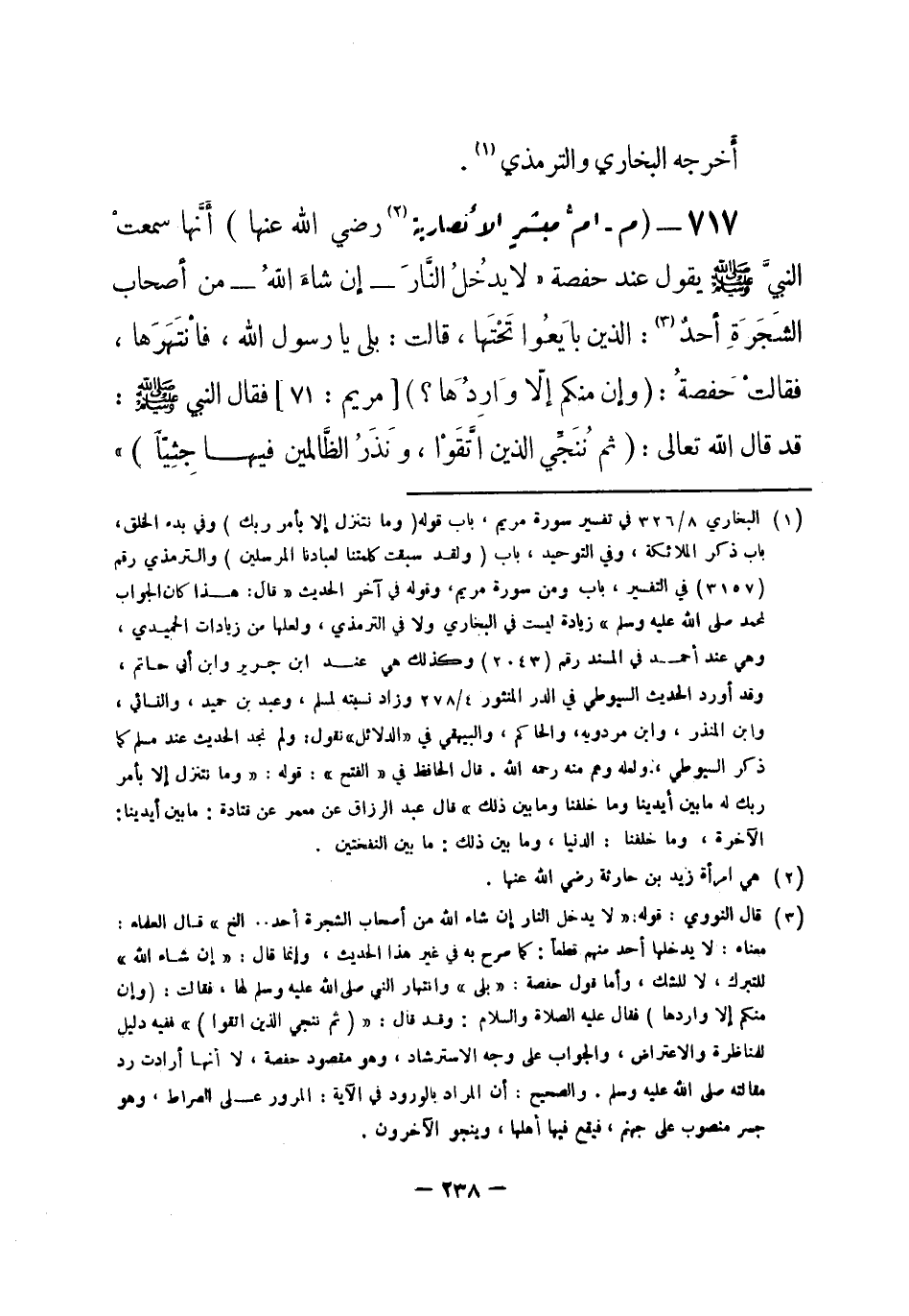 (¬2) قال النووي: قوله: " لا يدخل النار إن شاء الله من أصحاب الشجرة أحد ... الخ " قال العلماء: معناه: لا يدخلها أحد منهم قطعاً: كما صرح به في غير هذا الحديث، وإنما قال: " إن شاء الله " للتبرك، لا للشك، وأما قول حفصة: " بلى " وانتهار النبي صلى الله عليه وسلم لها، فقالت: {وإن منكم إلا واردها} فقال عليه الصلاة والسلام: وقد قال: " {ثم ننجي الذين اتقوا} " ففيه دليل للمناظرة والاعتراض، والجواب على وجه الاسترشاد، وهو مقصود حفصة، لا أنها أرادت رد مقالته صلى الله عليه وسلم. والصحيح: أن المراد بالورود في الآية: المرور على الصراط، وهو جسر منصوب على جهنم، فيقع فيها أهلها وينجو الآخرون.