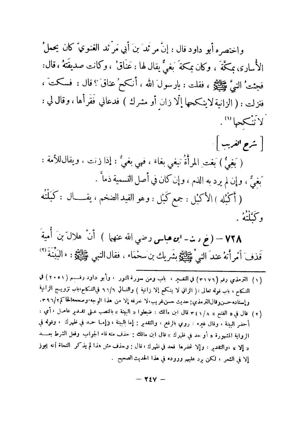 (¬3) البخاري 8 / 341 في تفسير سورة النور، باب {ويدرأ عنها العذاب} ، وفي الشهادات، باب إذا ادعى أو قذف فله أن يلتمس البينة، وفي الطلاق، باب يبدأ الرجل بالتلاعن. وأبو داود رقم (2254) في الطلاق، باب في اللعان، والترمذي رقم (3178) في التفسير، باب ومن سورة النور.