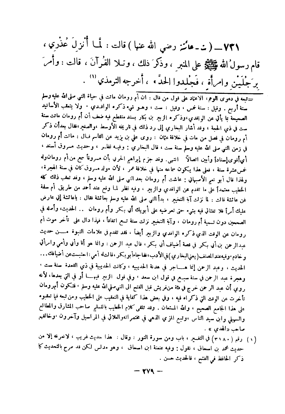731 - (ت) عائشة - رضي الله عنها -: قالت: لمَّا أُنْزِلَ عُذْرِي، قام رسولُ الله صلى الله عليه وسلم على المنبر، وذكرَ ذلك،وتلا القُرآنَ، قالت: وأَمرَ بِرَجُلَيْنِ وامرأَةٍ، فَجُلِدوا الحدَّ. أخرجه الترمذي (¬1) .