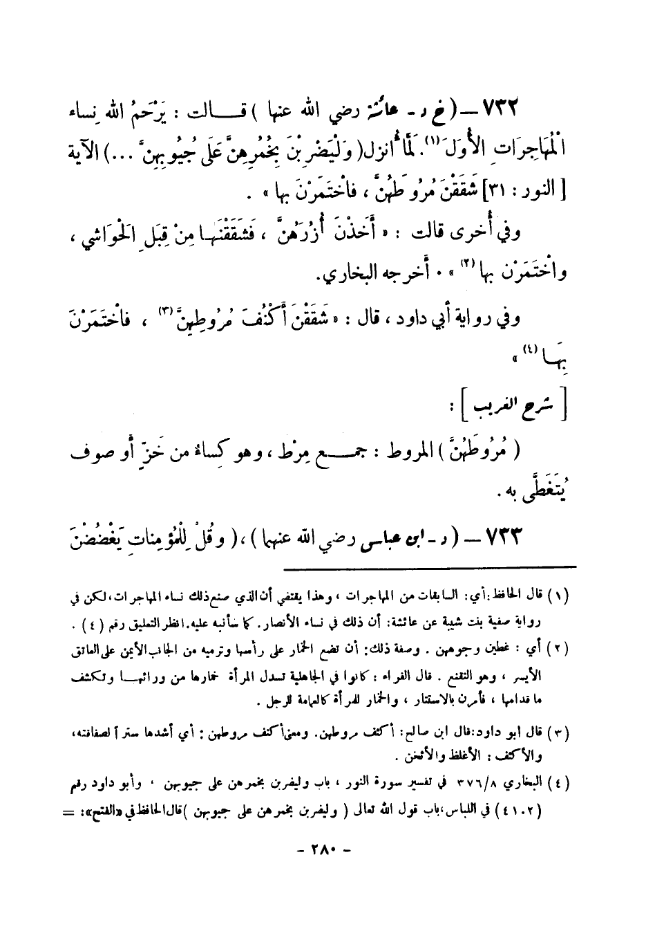 732 - (خ د) عائشة - رضي الله عنها -: قالت: يَرْحَمُ الله نِساء المُهَاجِرَاتِ الأُوَلَ (¬1) ، لَمَّا أُنزل {وَلْيَضْرِبْنَ بِخُمُرِهِنَّ عَلَى جُيُوبِهِنَّ ... } الآية [النور: 31] شَقَقْنَ، مُرُوطَهُنَّ فاخْتَمَرْنَ بها.