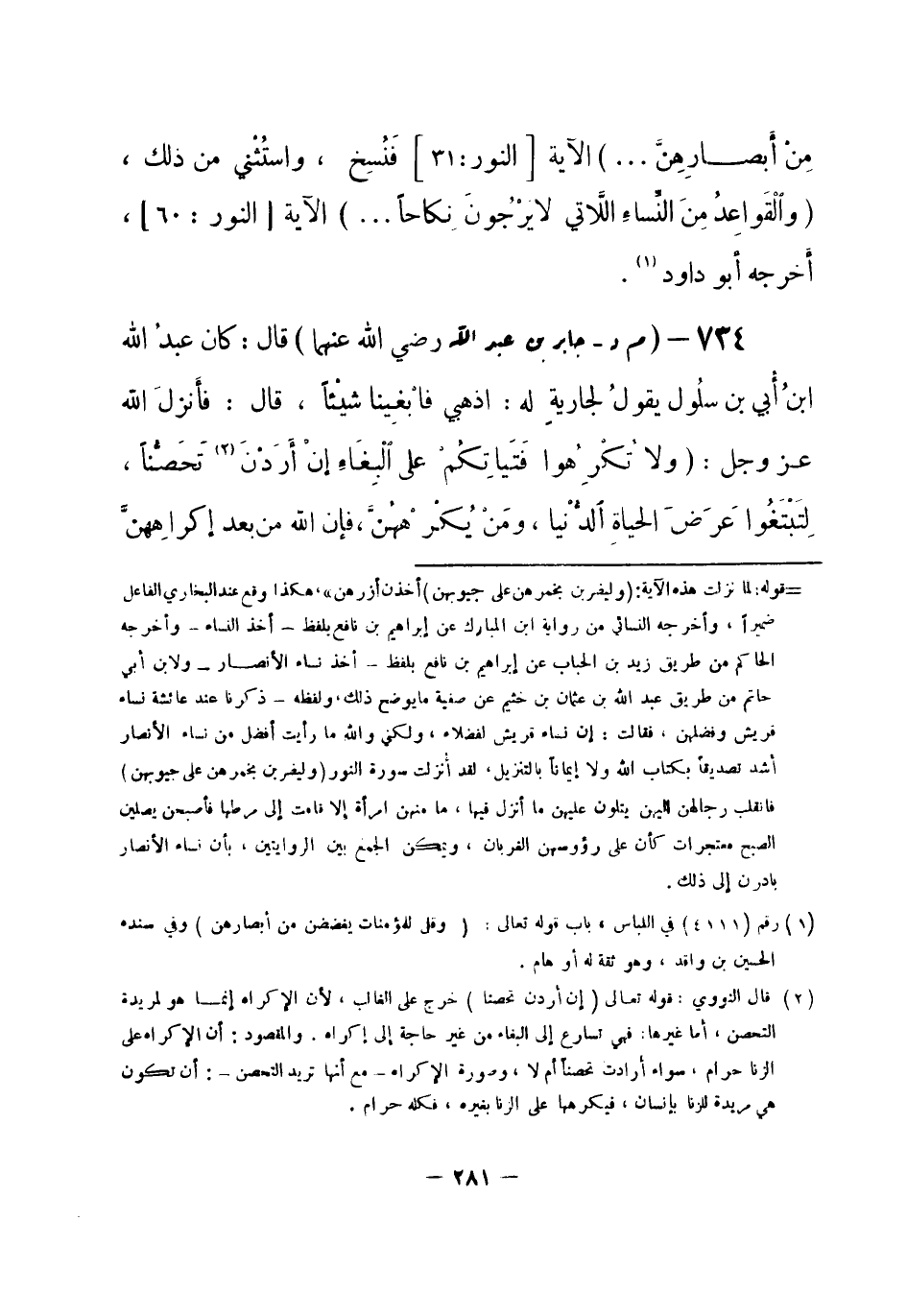734 - (م د) جابر بن عبد الله - رضي الله عنهما -: قال: كان عبدُ الله بنُ أُبيِّ بن سلُول يقولُ لجاريةٍ له: اذهبي فابْغينا شيْئاً، قال: فأَنزلَ الله عز وجل: {ولا تُكْرِهُوا فَتَياتِكُمْ على الْبِغَاءِ إنْ أَرَدْنَ (¬1) تَحصُّناً لِتَبْتَغُوا عَرَضَ الحياةِ الدُّنْيا ومَنْ يُكْرهْهُّنَّ فإن اللَّه من بعد إكراهِهنَّ -[282]- لَهُنَّ (¬2) - غَفُورٌ رَحيمٌ} [النور: 33] .