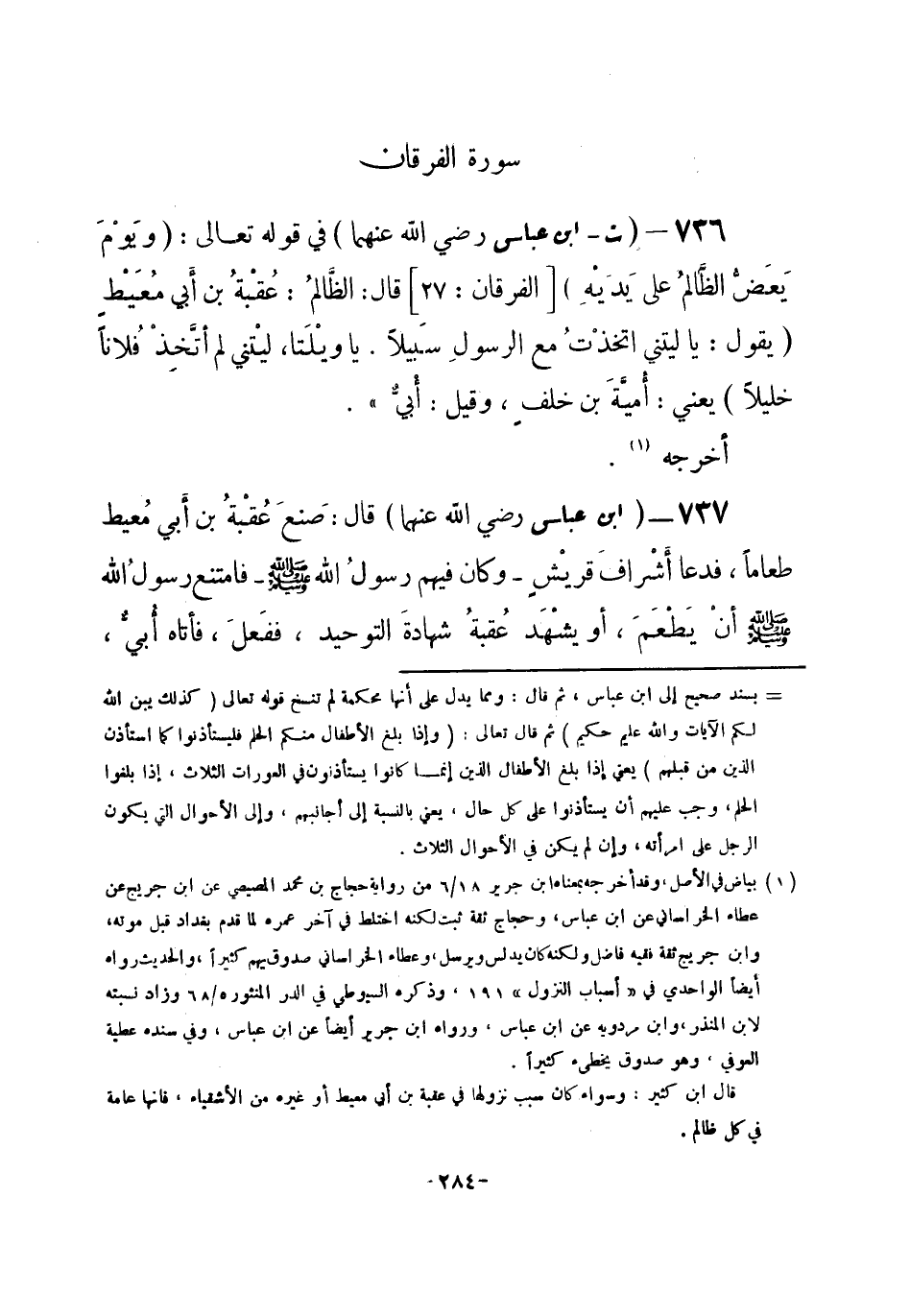 736 - (ت) ابن عباس - رضي الله عنهما -: في قوله تعالى: {ويَوْمَ يَعَضُّ الظَّالمُ على يَدَيْهِ} [الفرقان: 27] قال: الظَّالمُ: عُقْبةُ بن أَبي مُعَيْط {يقول يا ليتني اتخذْتُ مع الرسولِ سَبيلاً. يا ويْلَتا ليْتني لم أتَّخِذْ فُلاناً خليلاً} يعني: أُميَّةَ بن خلفٍ، وقيل: أُبيّ» .أخرجه (¬1) .