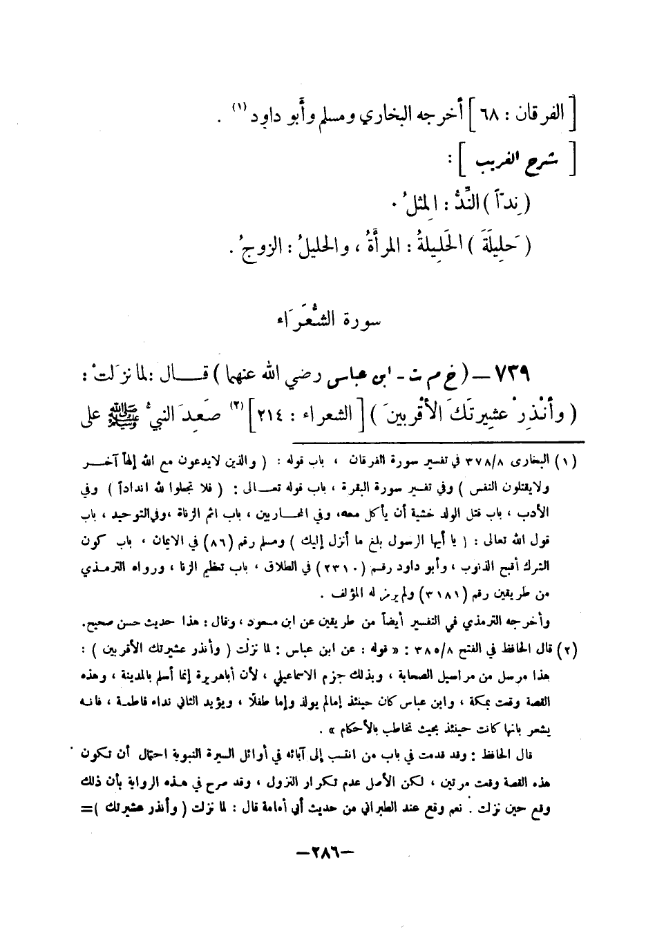 (¬1) قال الحافظ في " الفتح " 8 / 385: " قوله: عن ابن عباس: لما نزلت {وأنذر عشيرتك الأقربين} : هذا مرسل من مراسيل الصحابة، وبذلك جزم الإسماعيلي، لأن أبا هريرة إنما أسلم بالمدينة، وهذه القصة وقعت بمكة، وابن عباس كان حينئذ إما لم يولد، وإما طفلاً، ويؤيد الثاني نداء فاطمة، فإنه يشعر بأنها كانت حينئذ بحيث تخاطب بالأحكام ".