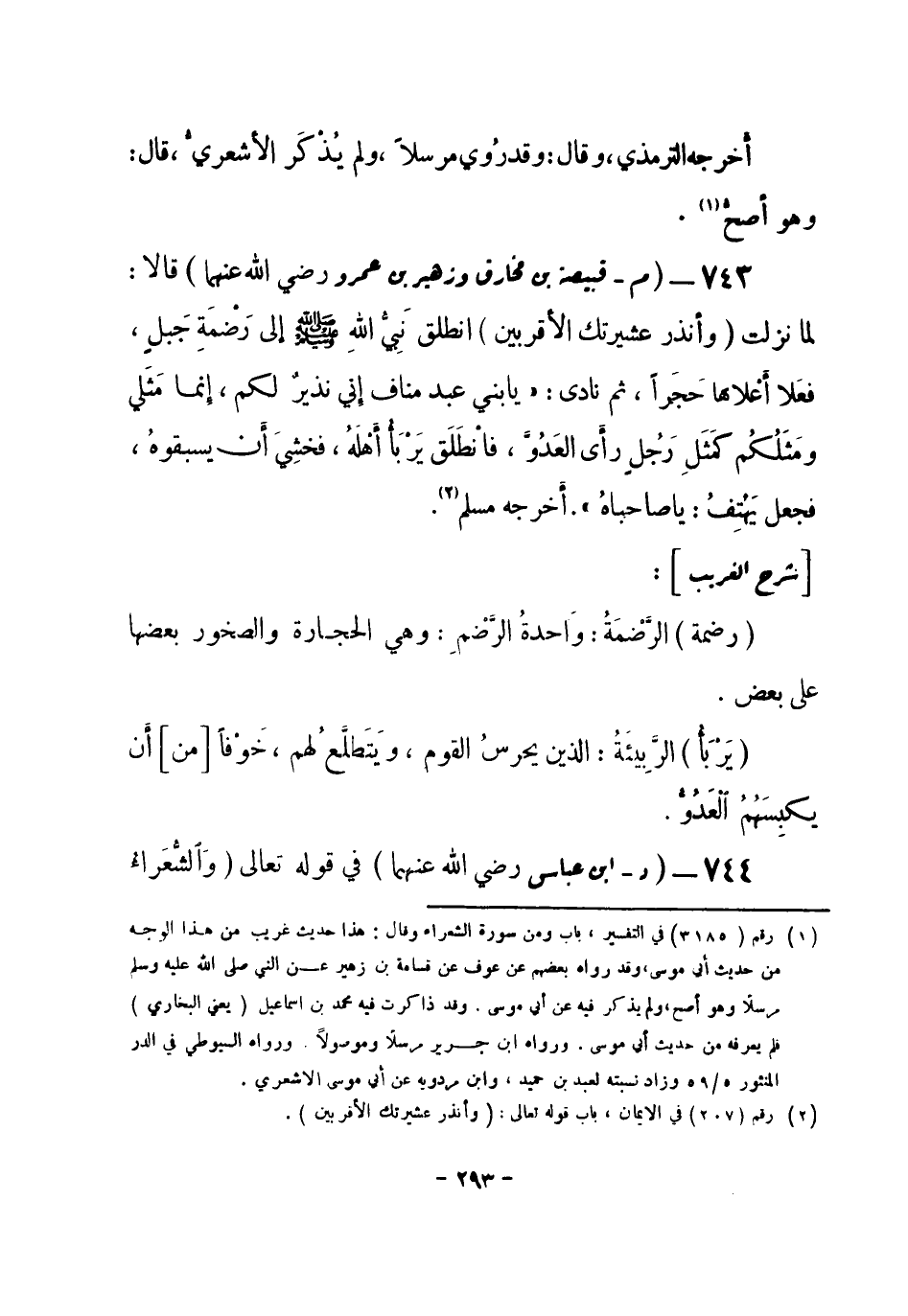 743 - (م) قبيصة بن مخارق وزهير بن عمرو - رضي الله عنهما -: قالا: لما نزلت {وأنْذِرْ عشِيرتَكَ الأْقربينَ} انطلقَ نبِيُّ اللهِ صلى الله عليه وسلم إلى رَضْمَةِ جَبلٍ، فعَلا أعْلاها حَجَراً، ثم نادى: «يا بني عبدٍ منافٍ إِني نَذِيرٌ لكم، إِنما مَثَلي ومَثَلُكُم كمَثَلِ رَجُلٍٍ رأَى العَدُوَّ، فانْطَلَق يَرْبَأُ أَهْلَهُ، فخشِيَ أَن يسبقوهُ، فجعل يَهْتِفُ: «يا صاحباهُ» .أخرجه مسلم (¬1) .