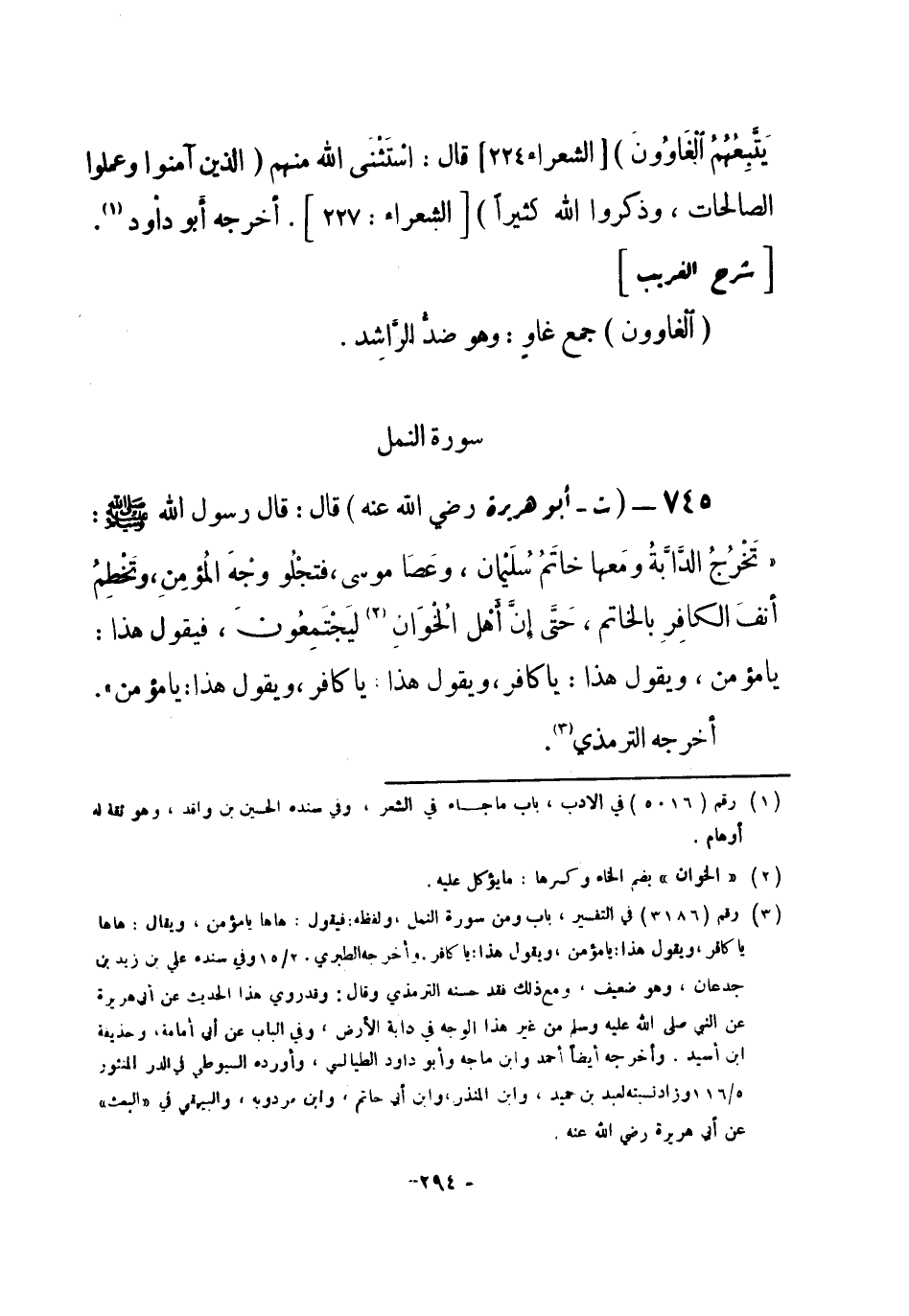 (¬2) رقم (3186) في التفسير، باب ومن سورة النمل، ولفظه: ها ها يا مؤمن، ويقال: ها ها يا كافر، ويقول هذا: يا مؤمن، ويقول هذا: يا كافر. وأخرجه الطبري 20 / 15، وفي سنده علي بن زيد بن جدعان، وهو ضعيف، ومع ذلك فقد حسنه الترمذي وقال: وقد روي هذا الحديث عن أبي هريرة عن النبي صلى الله عليه وسلم من غير هذا الوجه في دابة الأرض، وفي الباب عن أبي أمامة، وحذيفة بن أسيد، وأخرجه أيضاً أحمد وابن ماجة وأبو داود الطيالسي، وأورده السيوطي في " الدر المنثور " 5 / 116 وزاد نسبته لعبد بن حميد، وابن المنذر، وابن أبي حاتم، وابن مردويه، والبيهقي في " البعث " عن أبي هريرة رضي الله عنه.