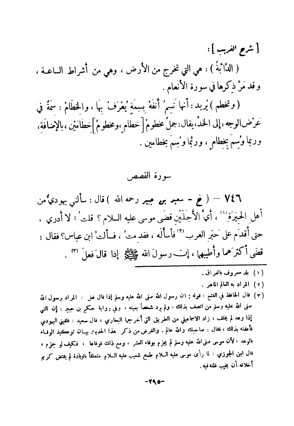 746 - (خ) سعيد بن جبير -رحمه الله -: قال: سألني يهوديّ من أهلِ الحيَرَةِ (¬1) ، أيَّ الأَجَلَيْنِ قضَى موسى عليه السلام؟ قلتُ: لا أَدري، حتى أقدَم على حَبْرِ العرب (¬2) فأسأَلَه، فقدِمتُ، فسألتُ ابن عباس؟ فقال: قضَى أكثرَهما وأطيبهما، إنَّ رسولَ الله صلى الله عليه وسلم إذا قال فَعلَ (¬3) . -[296]- أخرجه البخاري (¬4) .