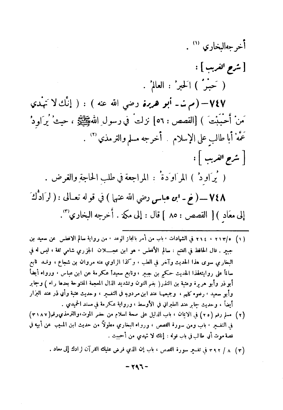 748 - (خ) ابن عباس - رضي الله عنهما -: في قوله تعالى: {لرَادُّكَ إلى معَادٍ} [القصص: 85] قال: إلى مكة. أخرجه البخاري (¬1) . -[297]-