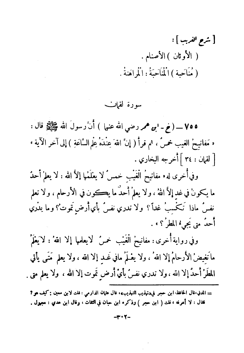 754 - (خ) ابن عمر - رضي الله عنهما -: أَنَّ رسولَ اللهِ صلى الله عليه وسلم قال: «مَفاتِيحُ الغيب خمسٌ، ثم قرأَ {إِنَّ اللَّهَ عِنْدَهُ عِلْمُ السَّاعَةِ} إلى آخر الآية» [لقمان: 34] أخرجه البخاري.