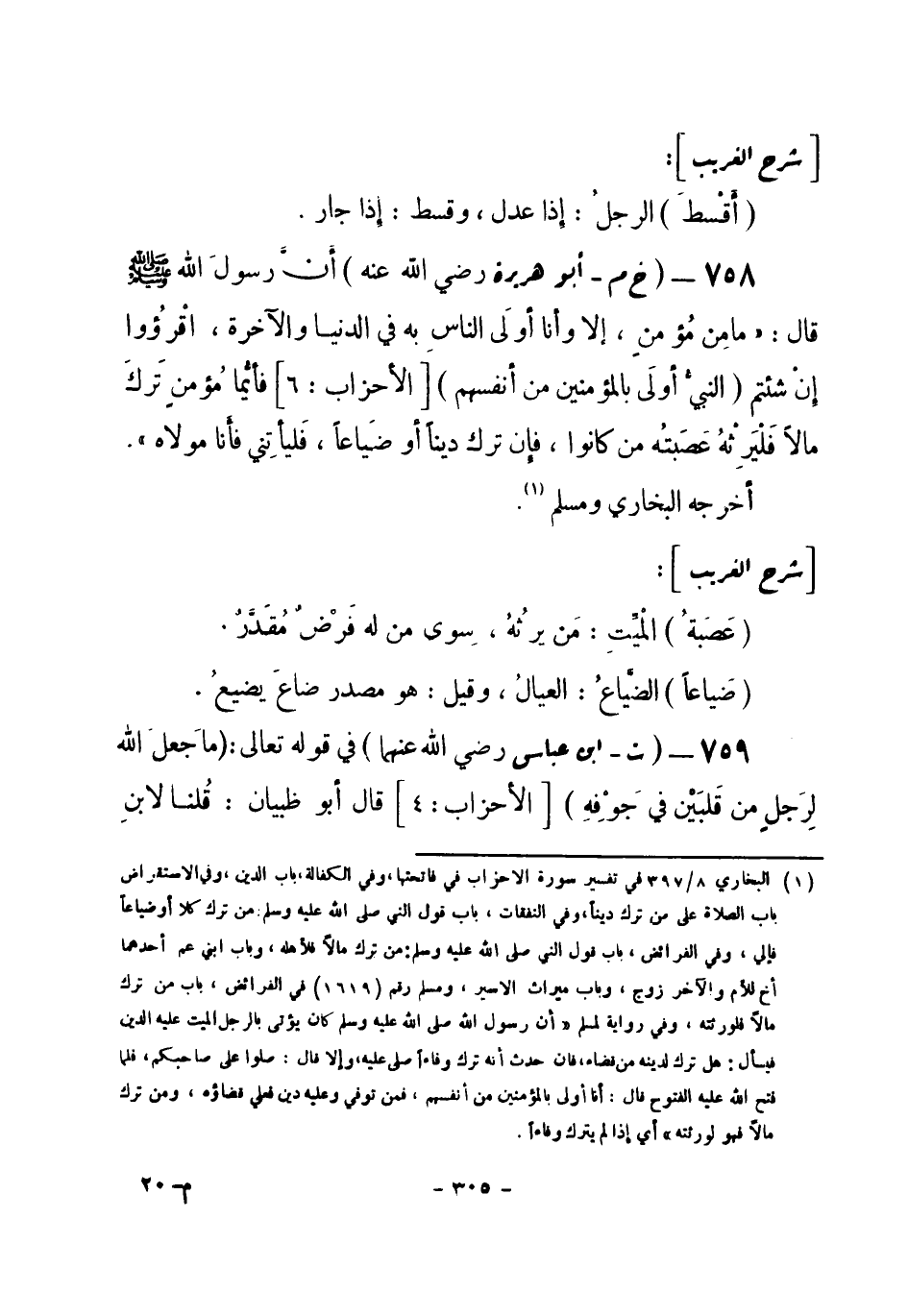 (¬1) البخاري 8 / 397 في تفسير سورة الأحزاب في فاتحتها، وفي الكفالة، باب الدين، وفي الاستقراض، باب الصلاة على من ترك ديناً، وفي النفقات، باب قول النبي صلى الله عليه وسلم: " من ترك كلاً أو ضياعاً فإلي "، وفي الفرائض، باب قول النبي صلى الله عليه وسلم: " من ترك مالاً فلأهله "، وباب ابني عم أحدهما أخ للأم والآخر زوج، وباب ميراث الأسير، ومسلم رقم (1619) في الفرائض، باب من ترك مالاً فلورثته، وفي رواية لمسلم " أن رسول الله صلى الله عليه وسلم كان يؤتى بالرجل الميت عليه الدين فيسأل: هل ترك لدينه من قضاء، فإن حدث أنه ترك وفاءاً صلى عليه، وإلا قال: صلوا على صاحبكم، فلما فتح الله عليه الفتوح قال: " أنا أولى بالمؤمنين من أنفسهم، فمن توفي وعليه دين فعلي قضاؤه، ومن ترك مالاً فهو لورثته " أي إذا لم يترك وفاءاً.