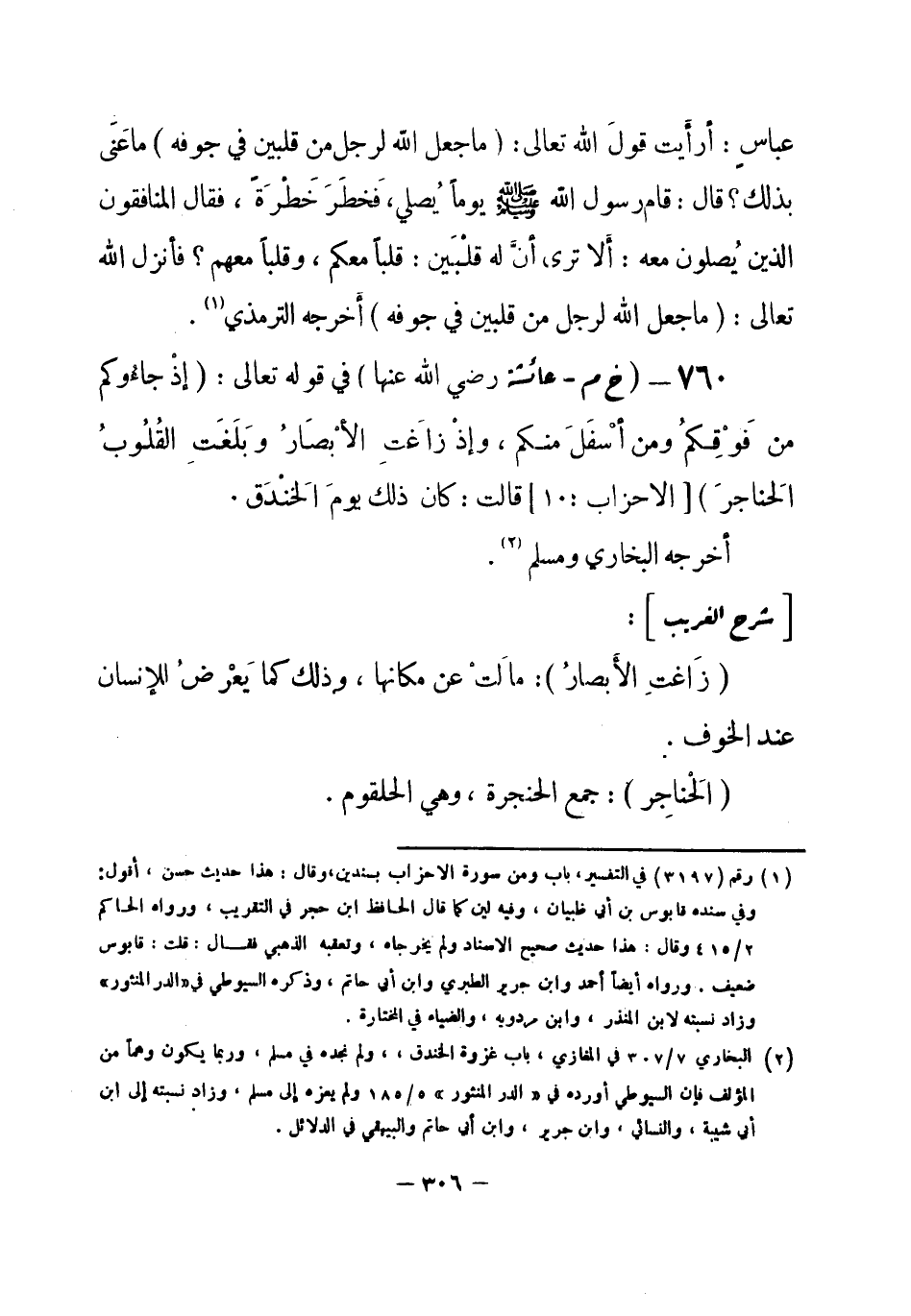 760 - (خ م) عائشة - رضي الله عنها -: في قوله تعالى {إذْ جاءُوكم من فَوْقِكُم ومن أسْفَلَ منكم وإذْ زَاغَتِ الأبْصَارُ وبَلَغَتِ القُلُوبُ الحَناجرَ} [الأحزاب: 10] قالت: كان ذلك يومَ الخَنْدَق. أخرجه البخاري، ومسلم (¬1) .