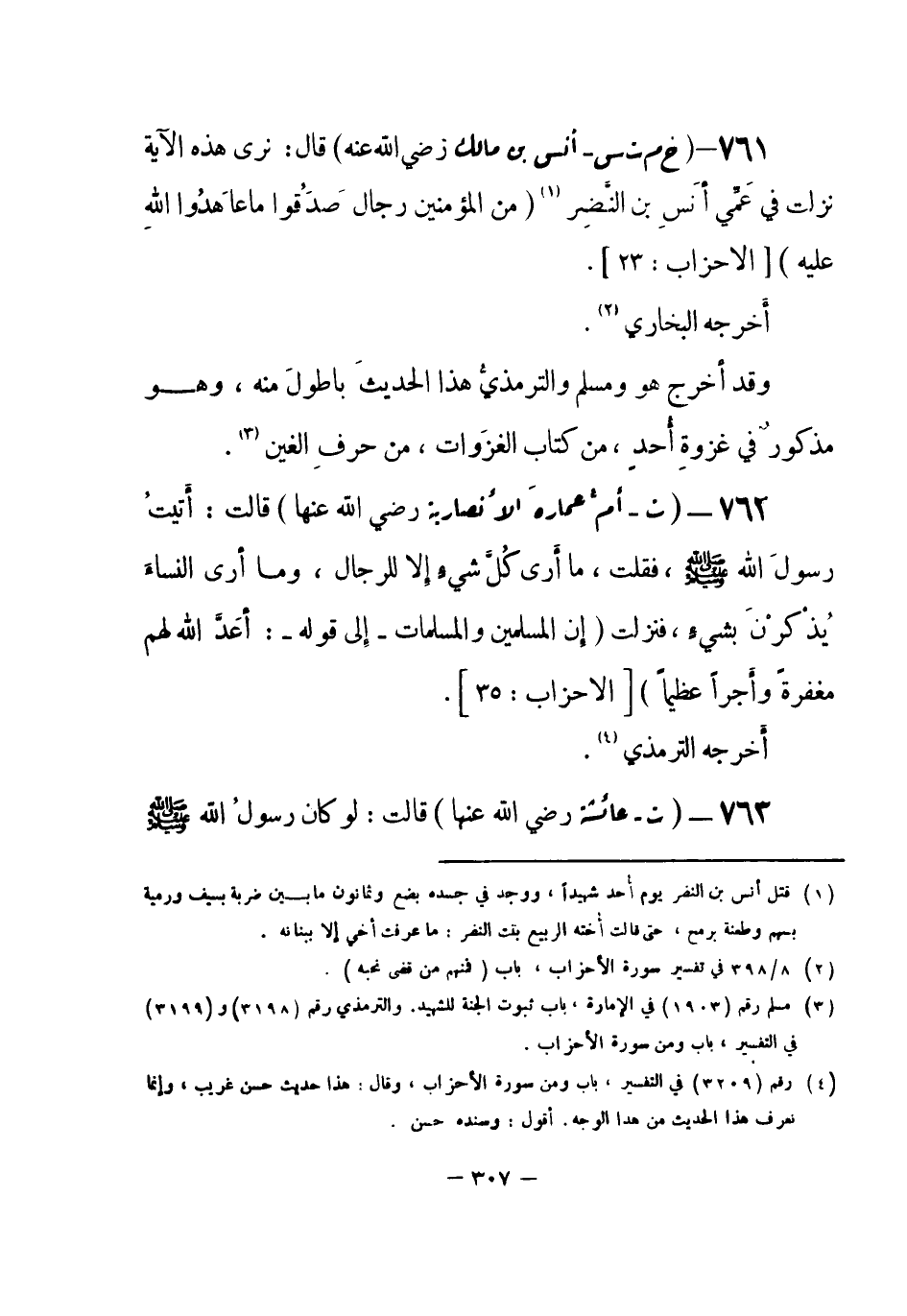761 - (خ م ت س) أنس بن مالك - رضي الله عنه -: قال: نَرى هذه الآية نزلت في عَمِّي أنَسِ بن النَّضِر (¬1) {من المؤمنين رجال صَدَقُوا ما عاهَدُوا اللَّهَ عليه} [الأحزاب: 23] . أخرجه البخاري (¬2) .