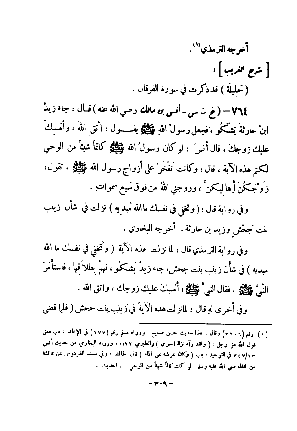 764 - (خ ت س) أنس بن مالك - رضي الله عنه -: قال: جاءَ زيدُ بن حارثةَ يشْكُو، فجعل رسولُ اللهِ صلى الله عليه وسلم يقول: اتقِ اللهَ، وأمْسِكْ عليك زوجكَ، قال أنسٌ لو كان رسولُ الله صلى الله عليه وسلم كاتماً شيئاً من الوَحْي، لكَتَم هذه الآية: قال: وكانت تَفْخَرُ على أزواج رسول الله صلى الله عليه وسلم، تقول: زَوَّجَكُنَّ أَهِالِيكنَّ، وزوجني اللهُ من فوق سَبع سمواتِ.