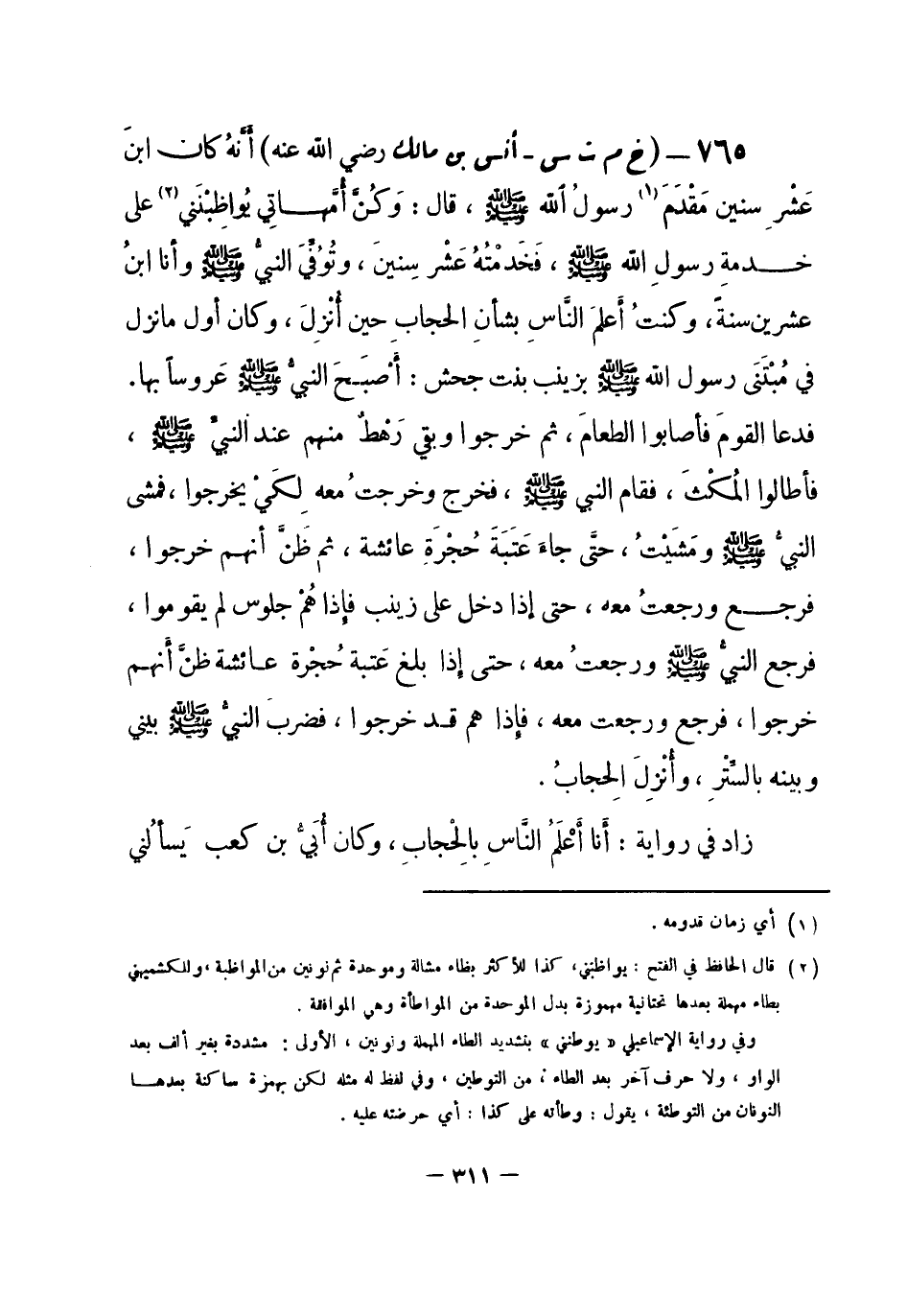 زاد في رواية: أَنا أَعْلَمُ النَّاسِ بالحِجَابِ، وكان أُبَيُّ بن كعب يَسألُني -[312]- عنه. هذه رواية البخاري ومسلم.