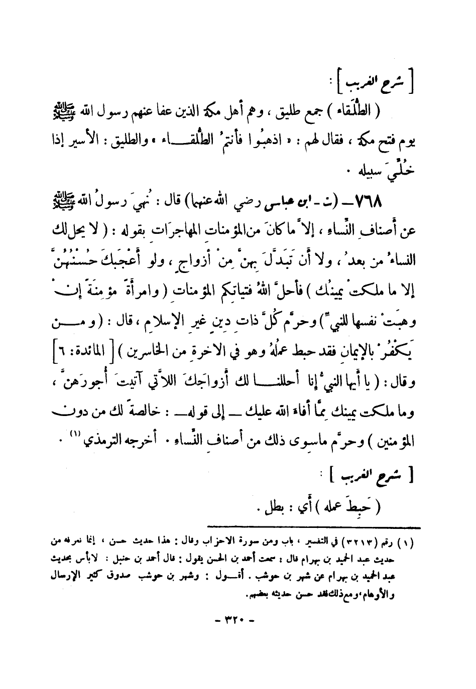 768 - (ت) ابن عباس - رضي الله عنهما -: قال: نُهيَ رسولُ الله صلى الله عليه وسلم عن أَصنافِ النِّساءِ، إلا ما كان من المؤمناتِ المهاجرَاتِ بقوله: {لا يحل لك النِّساءُ من بعدُ ولا أَن تَبَدَّلَ بِهنَّ مِنْ أزواجٍ ولو أَعْجَبكَ حُسْنُهُنَّ إلا ما ملكتْ يمينُك} فأحلَّ اللهُ فتياتِكم المؤمناتِ {وامرأَةً مؤمِنَةً إِنْ وهبَتْ نفسها للنبيِّ} وحرَّم كُلَّ ذات دِينٍ غير الإسلام، قال: {ومن يَكْفُرْ بالإيمانِ فقد حبط عملُهُ وهو في الآخرةِ من الخاسرين} [المائدة: 5] وقال: {يا أَيُّها النبيُّ إنا أحللنا لك أَزواجَكَ اللَّاتي آتيتَ أُجورَهنَّ وما ملكت يمينك مِمَّا أفاءَ اللَّه عليك - إلى قوله - خالصةً لك من دون المؤمنين} وحرَّم ما سِوى ذلك من أصنافِ النِّساءِ. أخرجه الترمذي (¬1) .