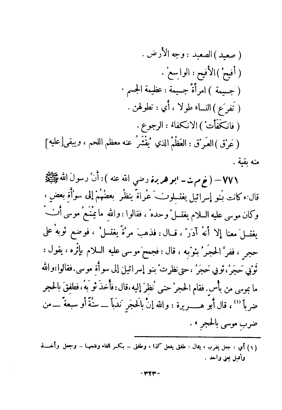 (¬3) البخاري 1 / 330 في الغسل، باب من اغتسل عرياناً وحده، وفي الأنبياء، باب حديث الخضر مع موسى عليهما السلام، وفي تفسير سورة الأحزاب، باب قوله {لا تكونوا كالذين آذوا موسى} ، ومسلم رقم (339) في الحيض، باب جواز الاغتسال عرياناً في الخلوة، ورقم (339) في الفضائل، باب فضائل موسى عليه السلام، والترمذي رقم (3219) في التفسير، باب ومن سورة الأحزاب.