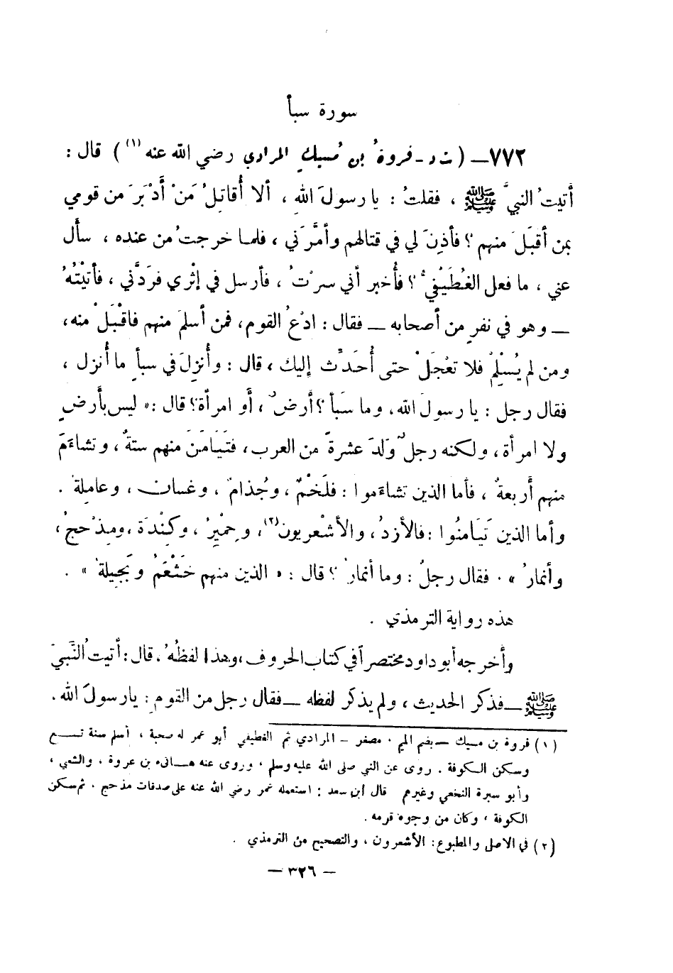 772 - (ت د) - (فروةُ بن مُسيكٍ المرادي - رضي الله عنه - (¬1) : قال: أَتيتُ النبيَّ صلى الله عليه وسلم، فقلتُ: يا رسولَ اللهِ، ألا أُقاتِلُ مَنْ أَدْبَرَ من قومي بمن أقبَلَ منهم؟ فأذِنَ لي في قتالهم وأمَّرَني، فلما خرجتُ من عنده، سأَل عني، ما فعل الغُطَيْفيُّ؟ فأُخبِرَ أني سِرْتُ، فأرسل في إثْري فرَدَّني، فأتيْتُهُ - وهو في نفرٍ من أصحابه - فقال: ادْعُ القوم، فمن أسلمَ منهم فاقْبَلْ منه، ومن لم يُسِلم فلا تَعْجَلْ حتى أُحَدِّث إليك، قال: وأُنزِلَ في سبأٍ ما أنزلَ، فقال رجل: يا رسولَ الله، وما سبَأ؟ أَرضٌ، أَو امرأة؟ قال: «ليس بأَرضٍ، ولا امرأة، ولكنه رجلٌ وَلدَ عشرة من العرب، فتَيَامَنَ منهم ستةٌ وتشاءمَ منهم أربعةٌ، فأما الذين تشاءموا: فلَخْمٌ، وجُذامٌ، وغسان، وعامِلةُ. وأما الذين تَيَامنُوا: فالأزدُ، والأشْعريون (¬2) ، وحِمَيرُ، وكِنْدَة، ومِذْحجُ، وأنمارُ» . فقال رجلٌ: وما أنمارُ؟ قال: «الذين منهم خَثْعَمُ وبَجيلةُ» . هذه رواية الترمذي.