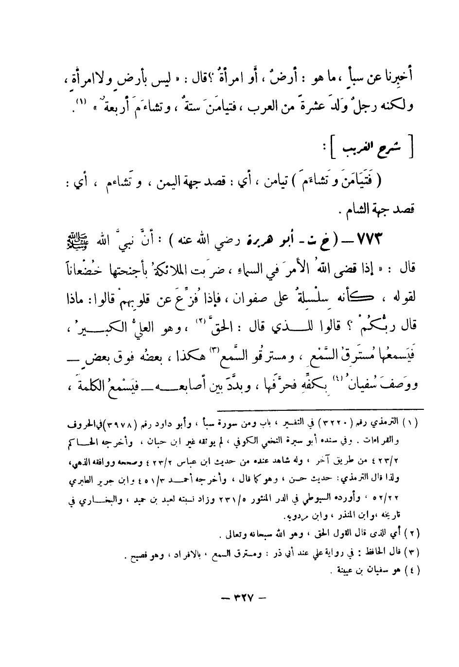 (¬4) البخاري 8 / 413، 414 في تفسير سورة سبأ، باب {حتى إذا فزع عن قلوبهم} ، وفي تفسير سورة الحجر، باب قوله: {إلا من استرق السمع} ، والترمذي رقم (3221) في التفسير، باب ومن سورة سبأ، وقال: حديث حسن صحيح.