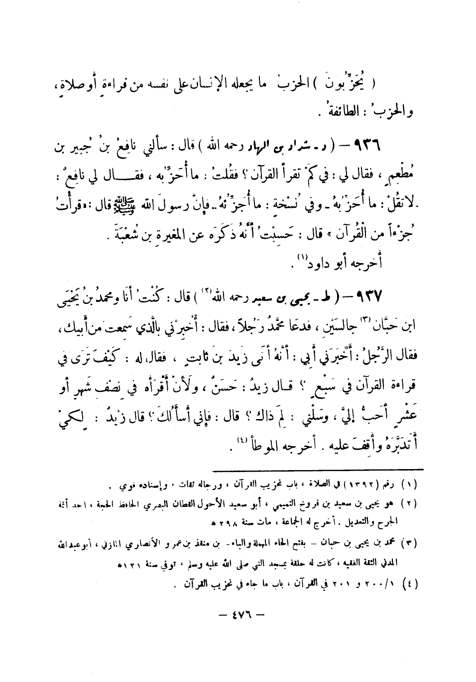 937 - (ط) يحيى بن سعيد -رحمه الله - (¬1) قال: كُنْتُ أنَا ومحمدُ بنُ يَحْيَى ابن حَبَّان (¬2) جالسَيْنِ، فدَعا محمَّدٌ رَجُلاً، فقال: أَخْبِرْني بالَّذي سَمِعتَ من أبيك، فقال الرَّجُلُ: أَخْبَرَني أبِي: أنَّهُ أتَى زَيدَ بن ثابتٍ، فقال له: كَيْفَ تَرى في قراءة القرآن في سَبْعٍ؟ قال زيدٌ: حَسَنٌ، ولأنْ أَقْرَأَه في نِصْفِ شَهرٍ أو عَشْرٍ أحَبُّ إليَّ، وسَلْني: لِمَ ذاك؟ قال: فإني أسأَلُكَ؟ قال زْيدٌ: لكَيْ أتَدَبَّرَهُ وأقِفَ عليه. أخرجه الموطأ (¬3) .